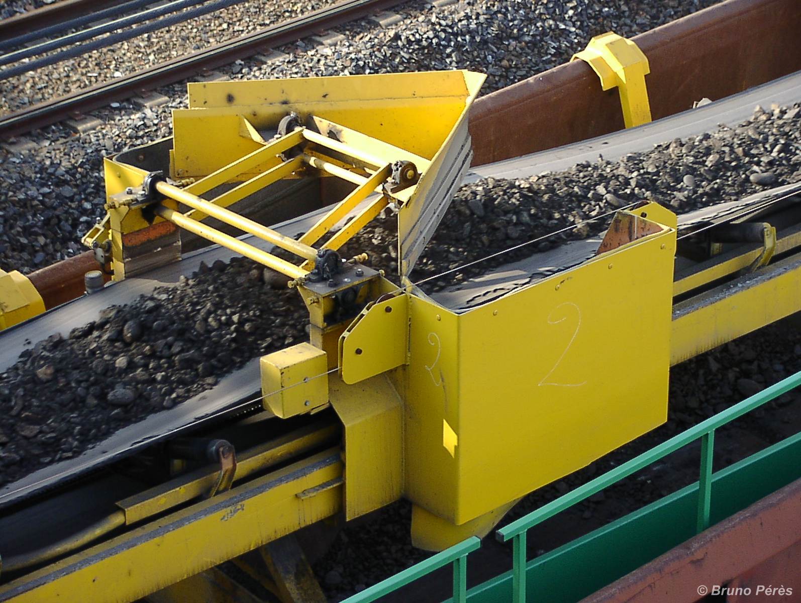 Ces bandes transbordeuses (est-ce le nom véritable ? J'ai déjà lu tapis ou encore convoyeurs ...) existent sous plusieurs types. Voici celles utilisées actuellement par l'entreprise ETF. Le soc peut avancer ou reculer, se lever ou se baisser alors que la bande peut basculer de droite ou de gauche, tout ça pour répartir au mieux le vieux ballast dans les différents wagons d'une part, et d'autre part dans chaque wagon. Mais des photos valant mieux qu'un long discours, en voici 4 prises entre novembre 2007 et février 2008 entre Toulouse et Montlaur.