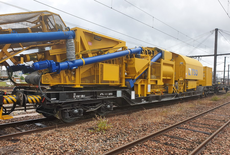 Wagon surbaissé Malaxeur ciment pour la rame béton de TSO 99 87 9 387 508-4 de 23 m et d'une Tare de 56 T