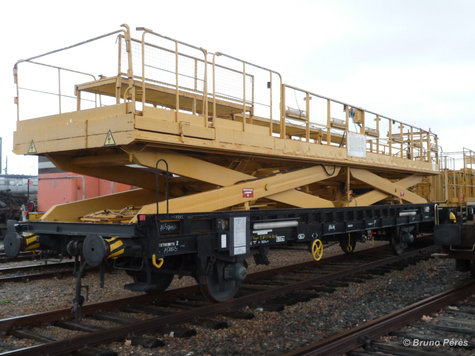 Voici un wagon plateforme un peu particulier puisqu'il s'agit d'un ex wagon Ufr bi-porteur chargé autrefois de transporter des remorques routières. Il s'agit exactement de l'ex HR 597437.