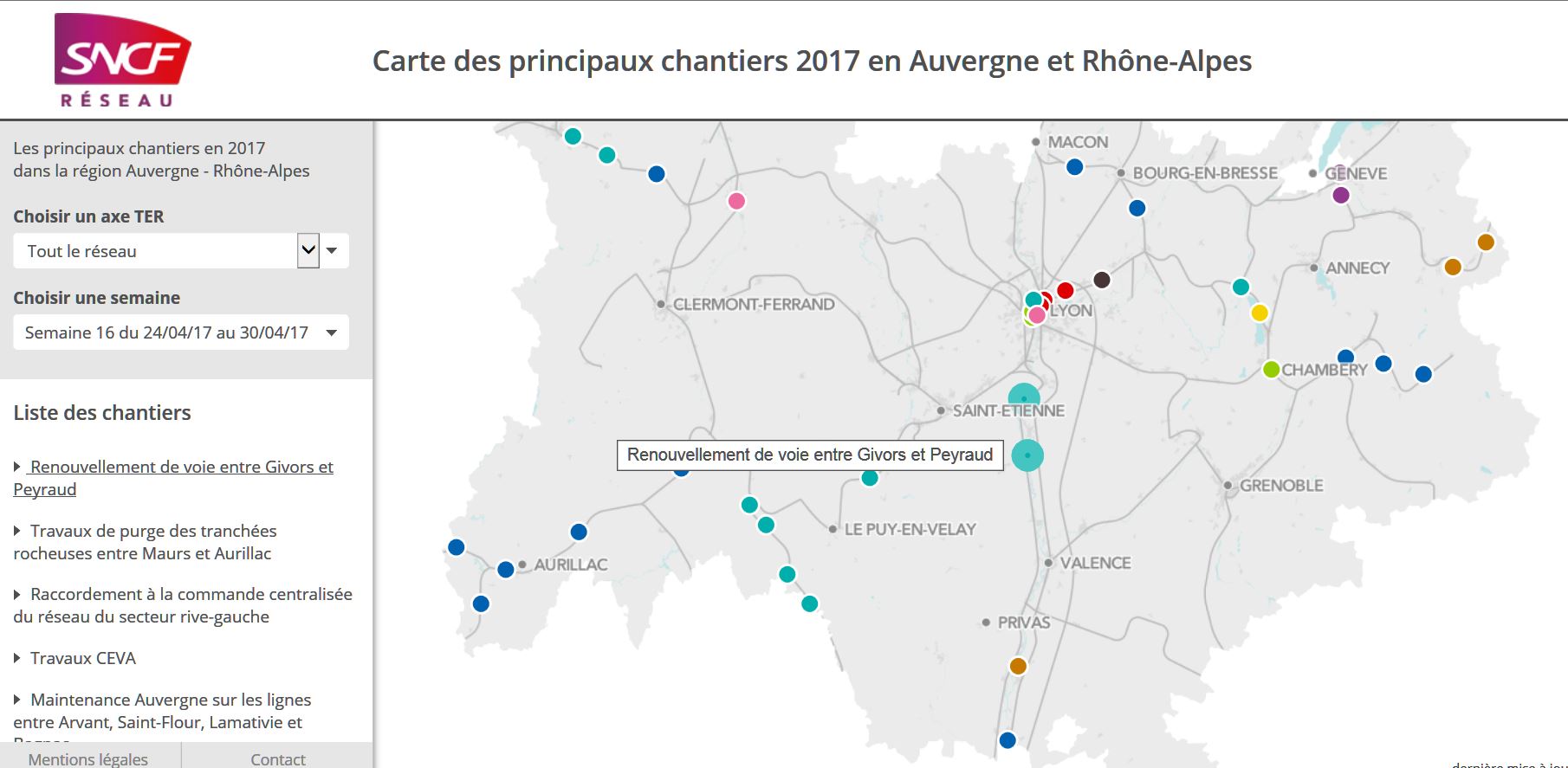 Afin de vous apporter une information détaillée et actualisée sur la teneur de ces chantiers et leur impact semaine après semaine, une carte interactive en ligne est dorénavant disponible sur : http://www.carte-des-chantiers-reseau-r ... uvergne.fr