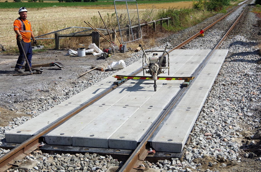 PN n°81 de la gare de Barenton-Bugny PK 147,716 avec l'installation de Platelages en grandes dalles préfabriquées en béton armé avec gorges où