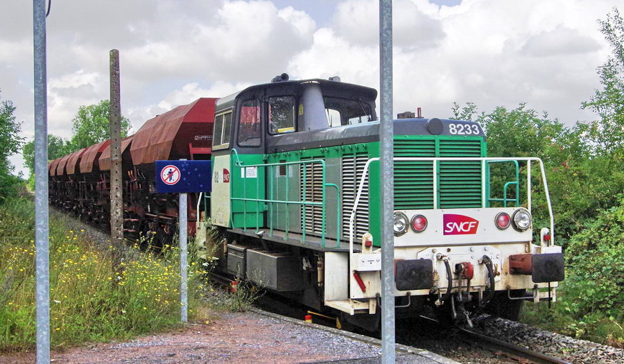 passage de la rame de travaux aves des trémies et le locotracteur Y 8233 de l'Infra au niveau du PN n°87