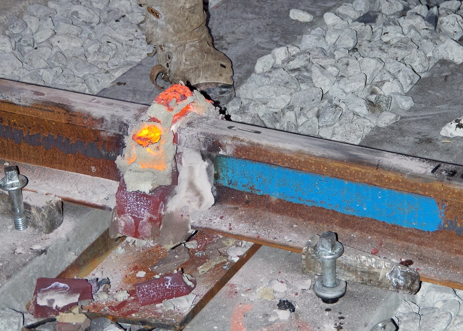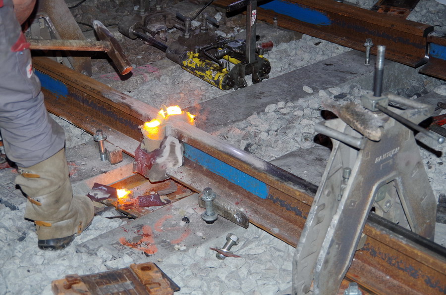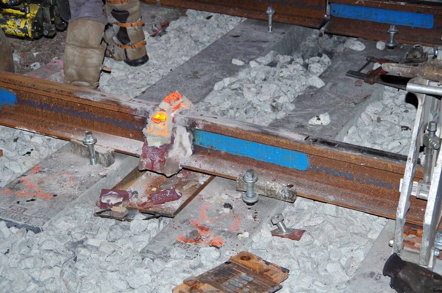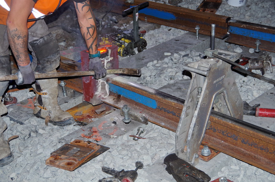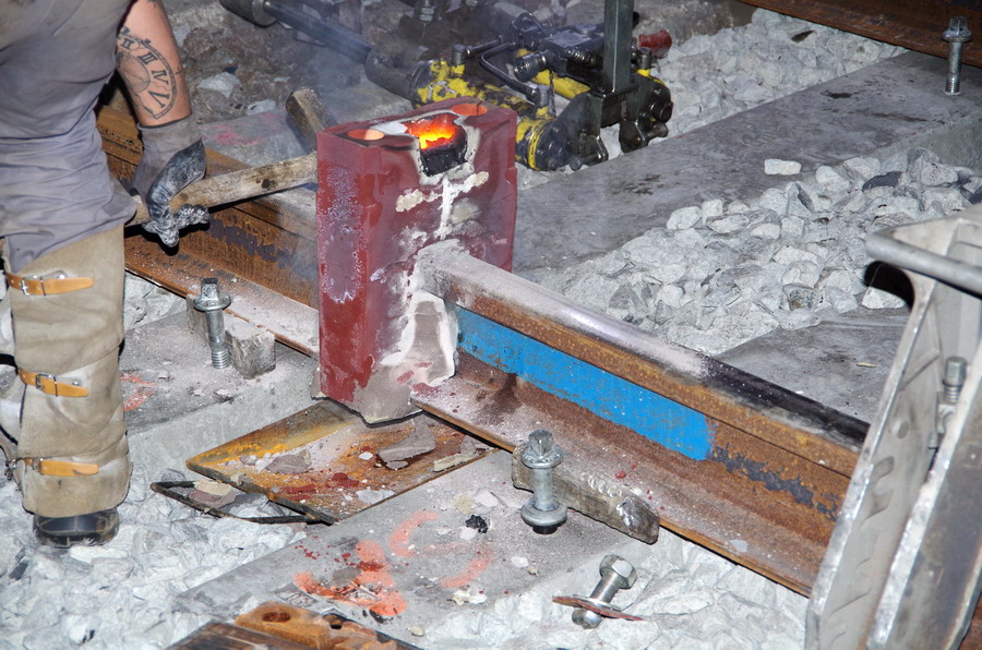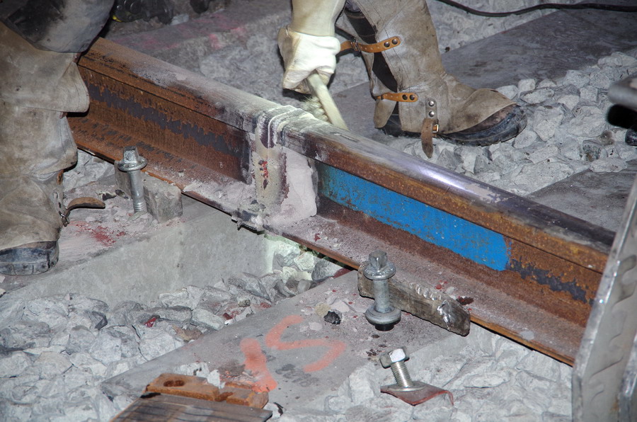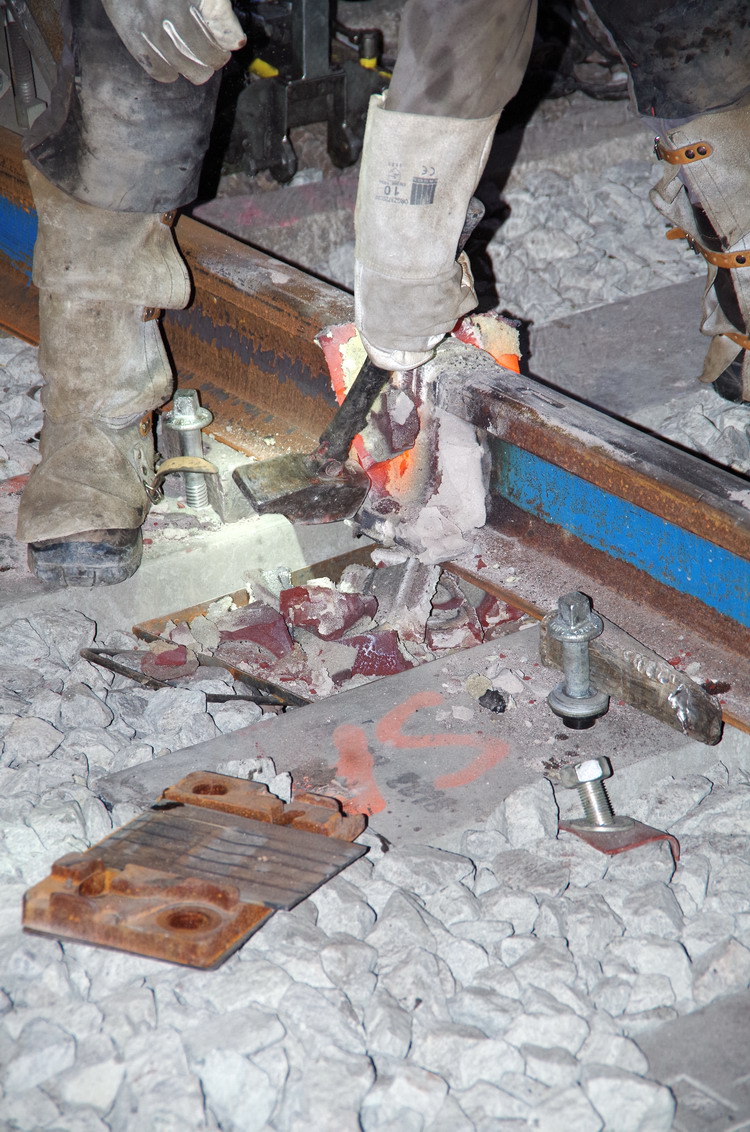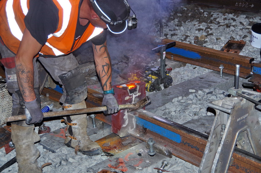 puis décalaminage après la soudure Aluminothermique et le meulage des rails neufs avant la mise en circuit (La calamine est un