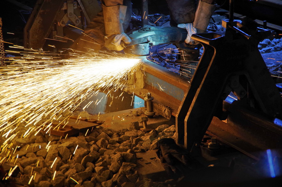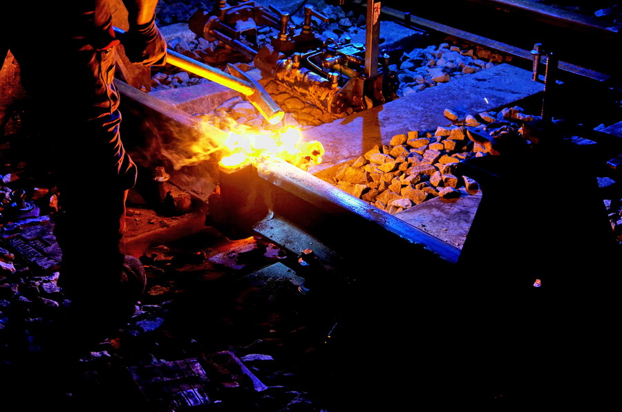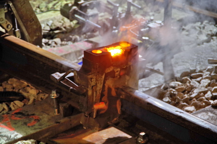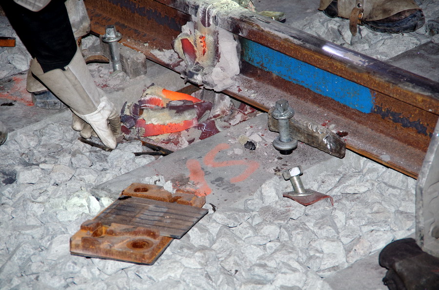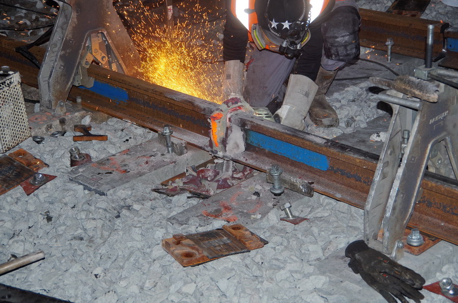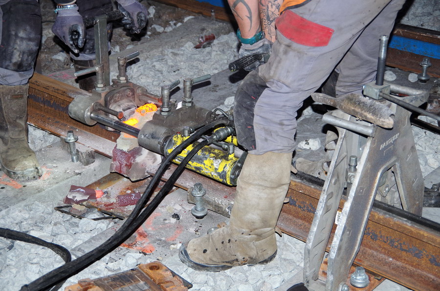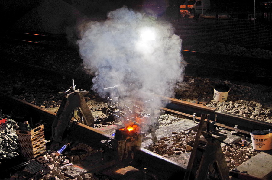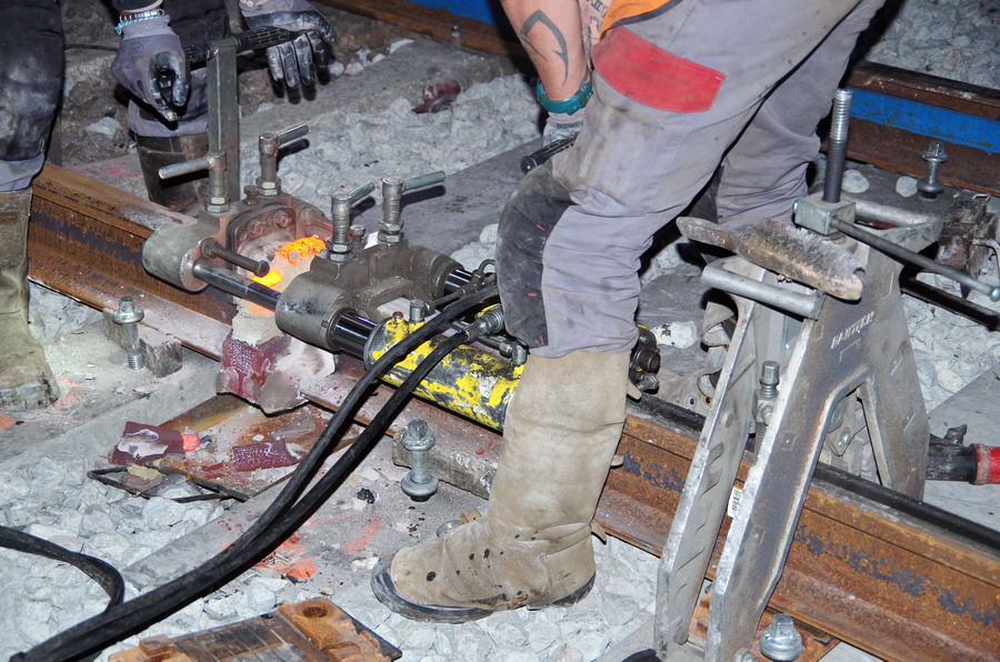 puis décalaminage après la soudure Aluminothermique et le meulage des rails neufs avant la mise en circuit (La calamine est un