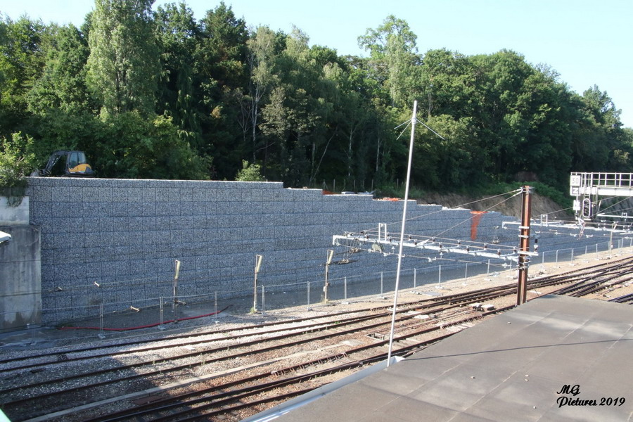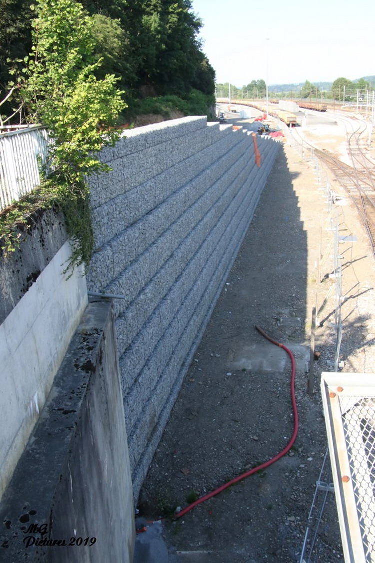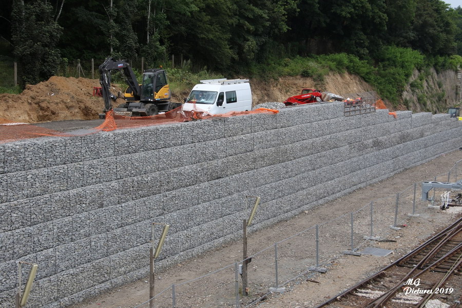 suite des travaux pour le mur de soutènement en pierre empilées dans des cages grillagées le 01-07-2019