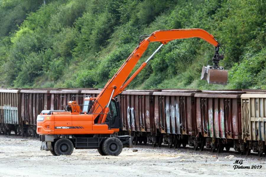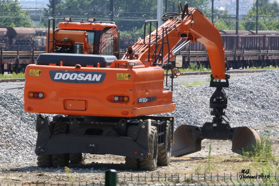Pelle route DOOSAN DX190W pour le transfert du ballast la base de travaux du Puy-Imbert le 03-07-2019