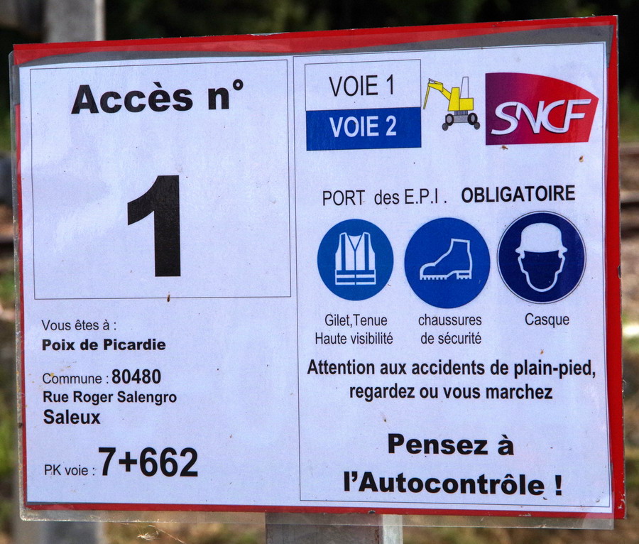 panneau au niveau du PN n°1 avec l'accès n°1 PK7,662 pour la voie 2 commune de Saleux (80) le 27-08-2019