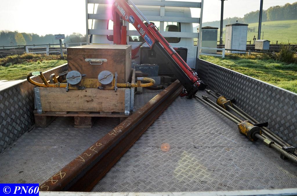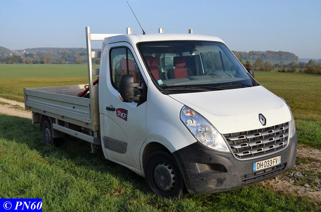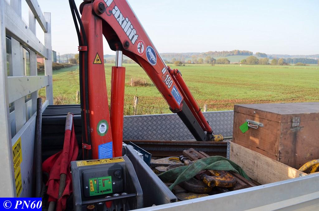Le 17 octobre 2017 au PN 55 de Doncourt sur Meuse, vu une camionnette Renault Master plateau de la SNCF équipée d'une petite grue Maxilift.