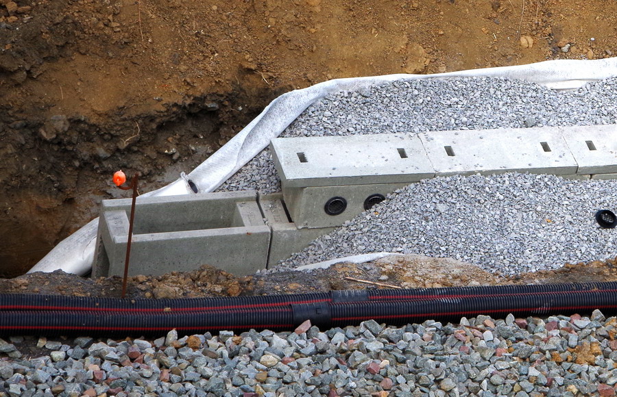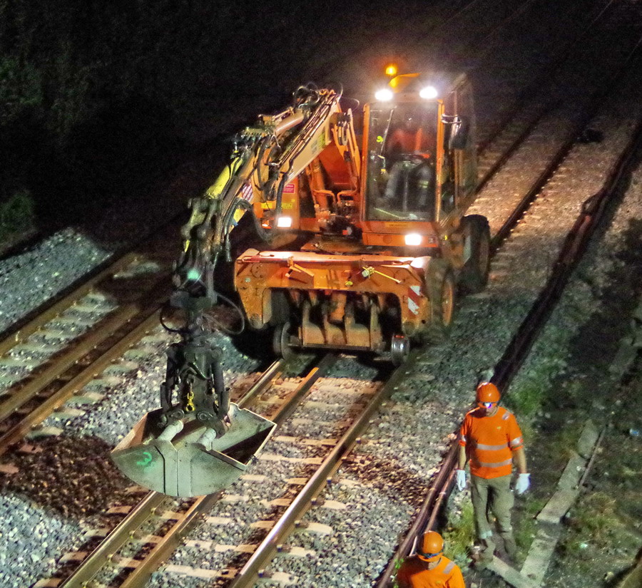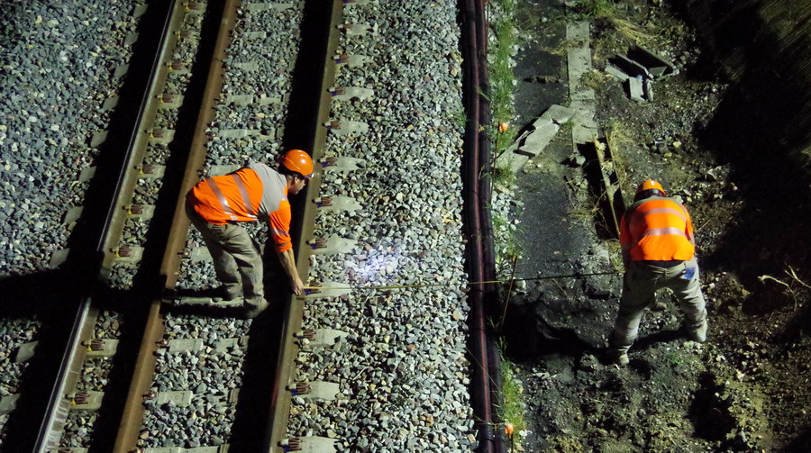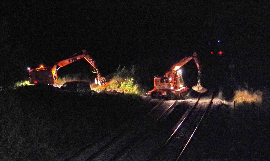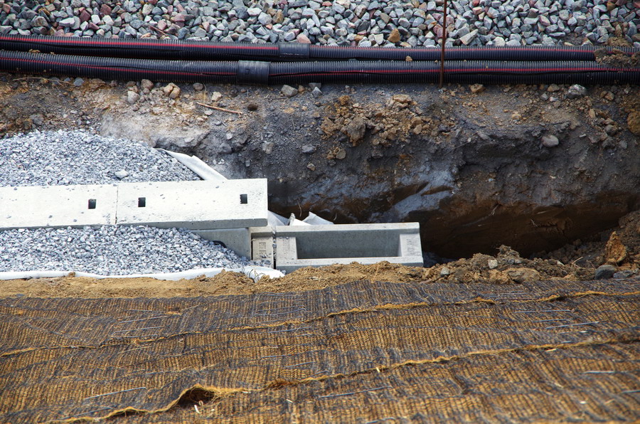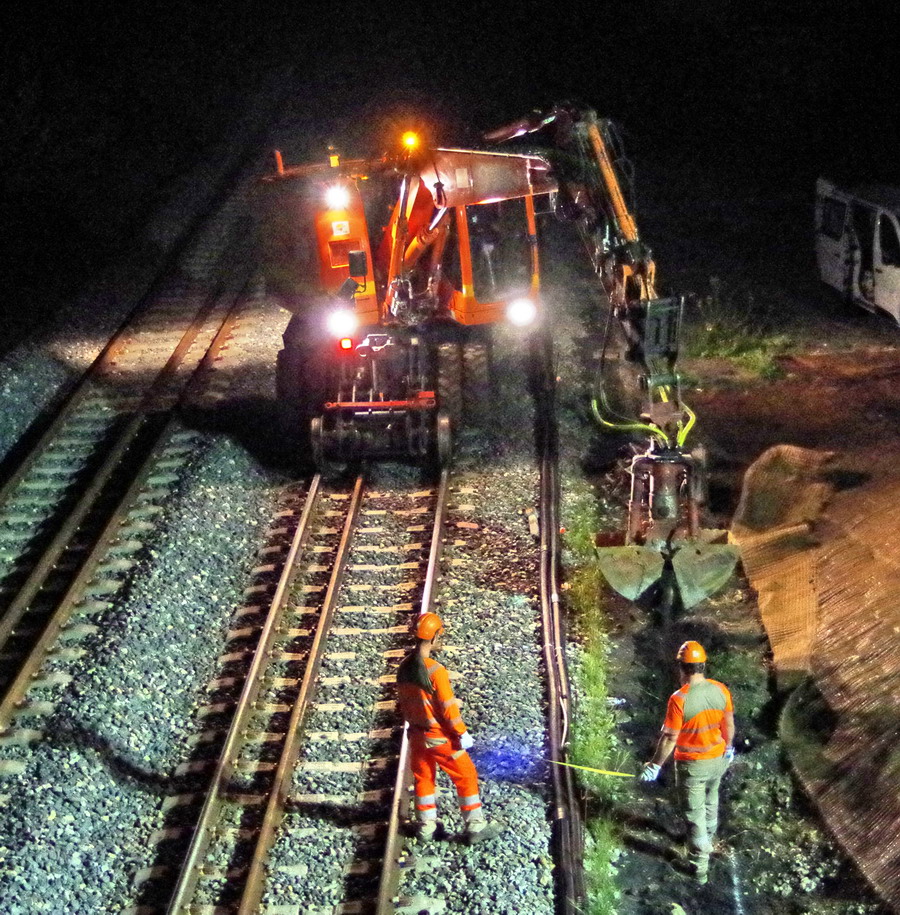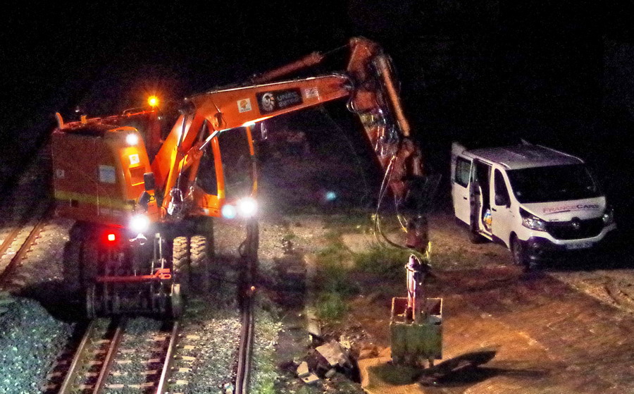 les travaux au niveau des Ponts de Bray à Jussy, pour l'installation des caniveaux le long du talus et de la voie 2
