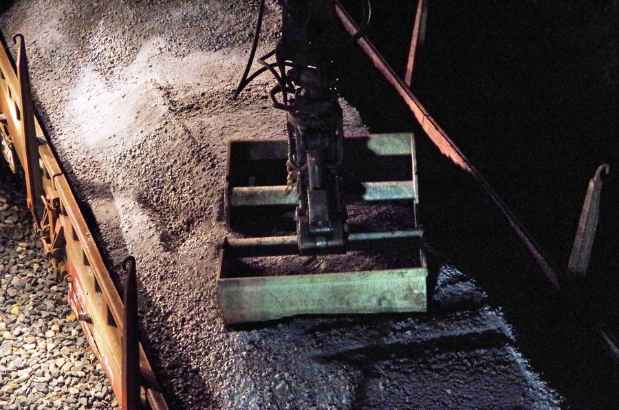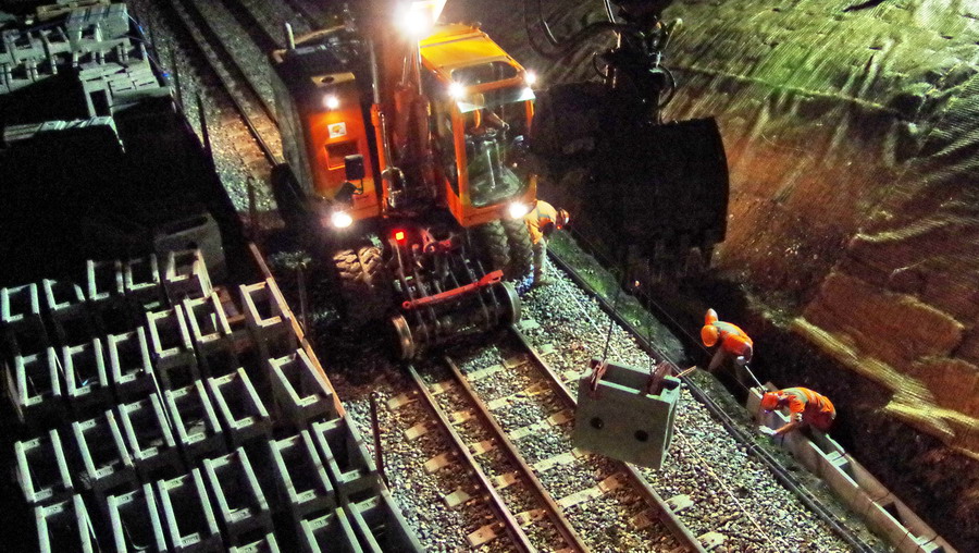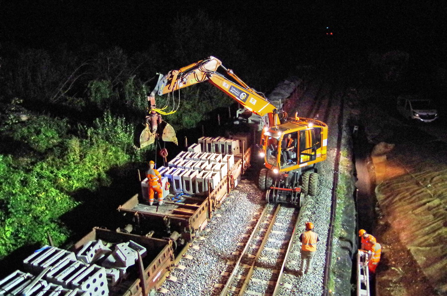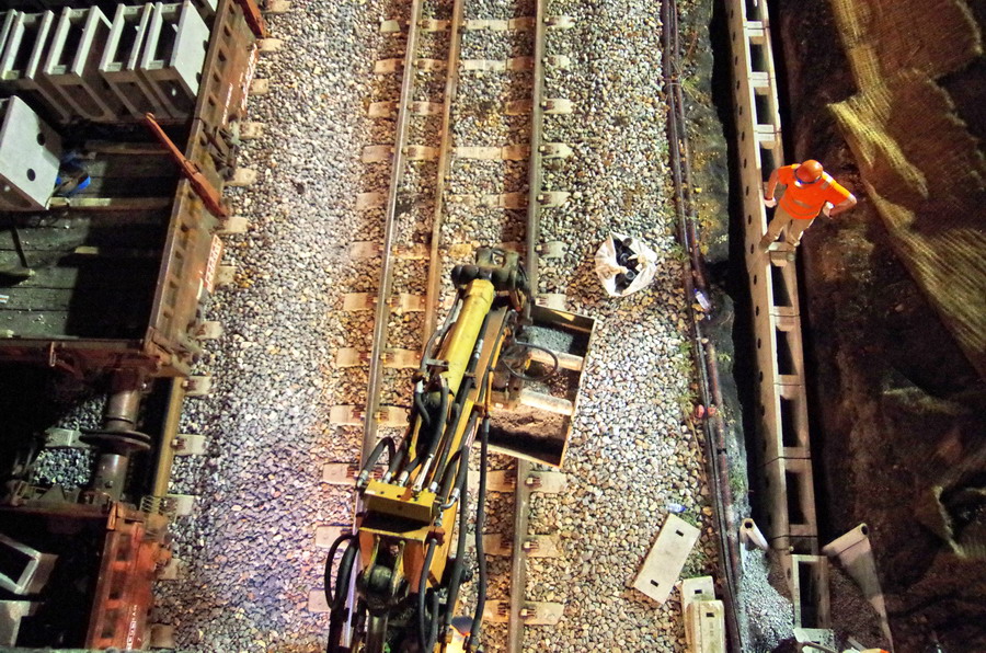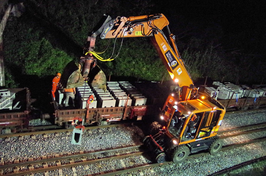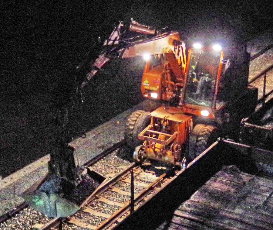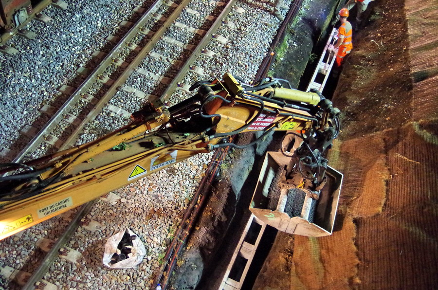 avec la présence des deux Pelles Rail route Colas Rail pour les travaux de caniveau