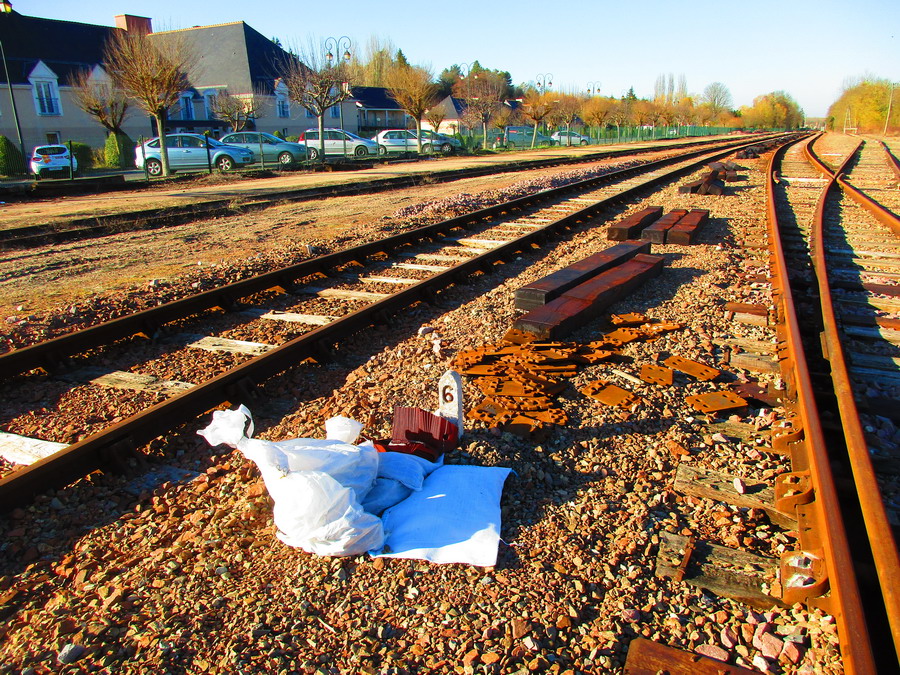 Loches : les traverses repérées à la peinture blanche sont à remplacer. 141 traverses à remplacer sur environ 200 mètres au niveau de la gare de Loches.le 25-02-2019