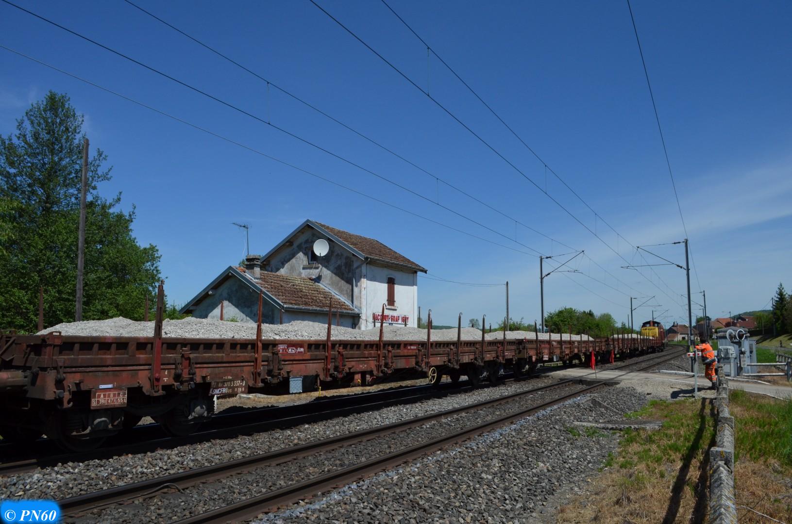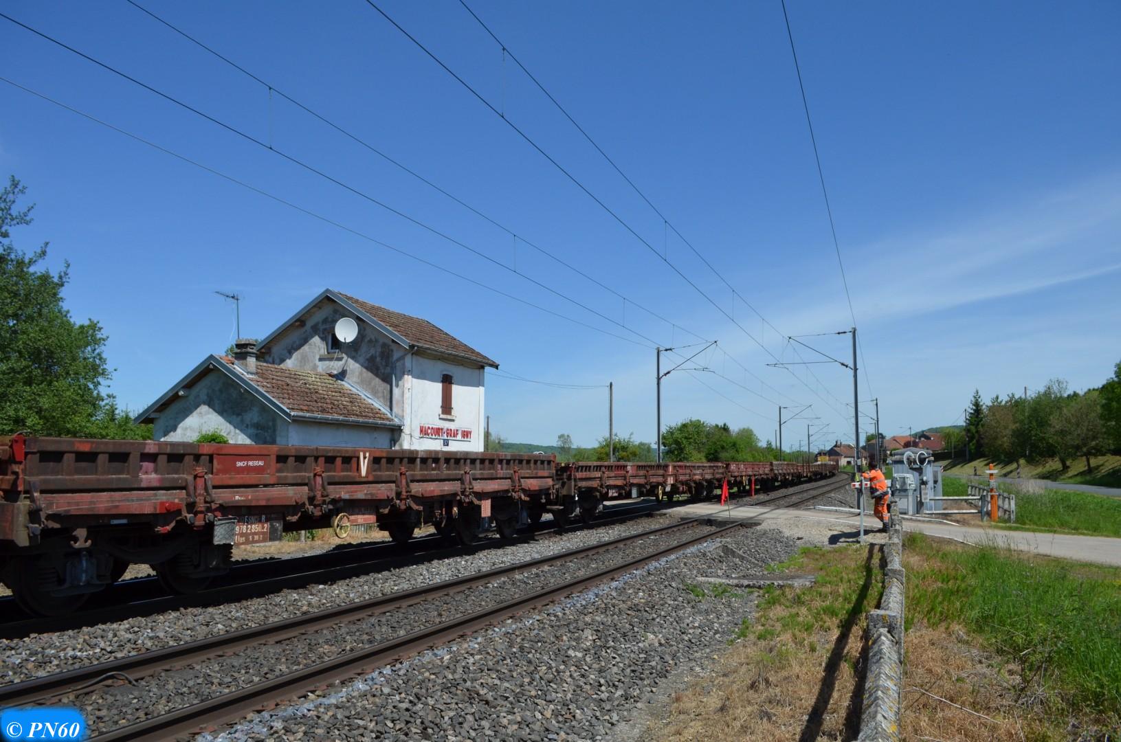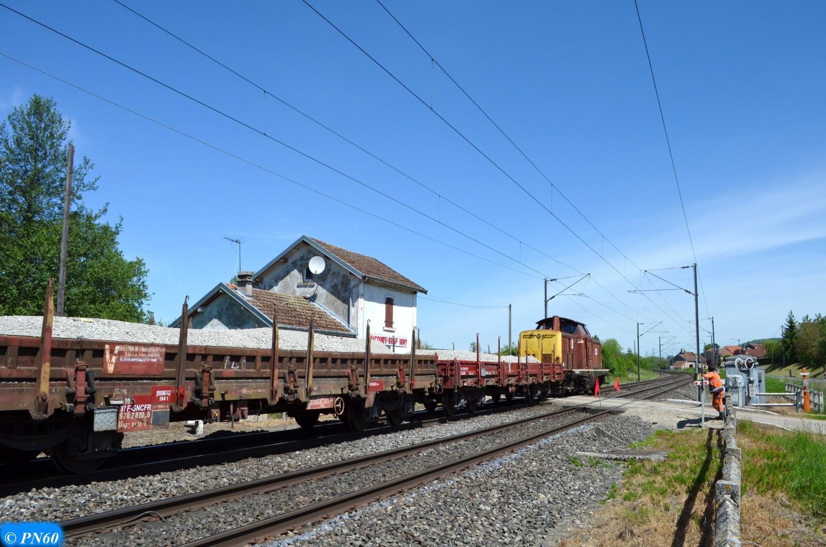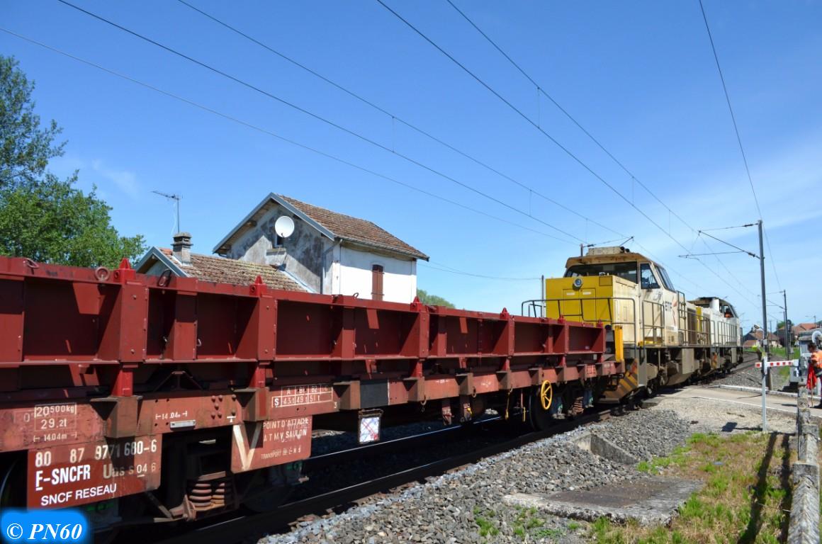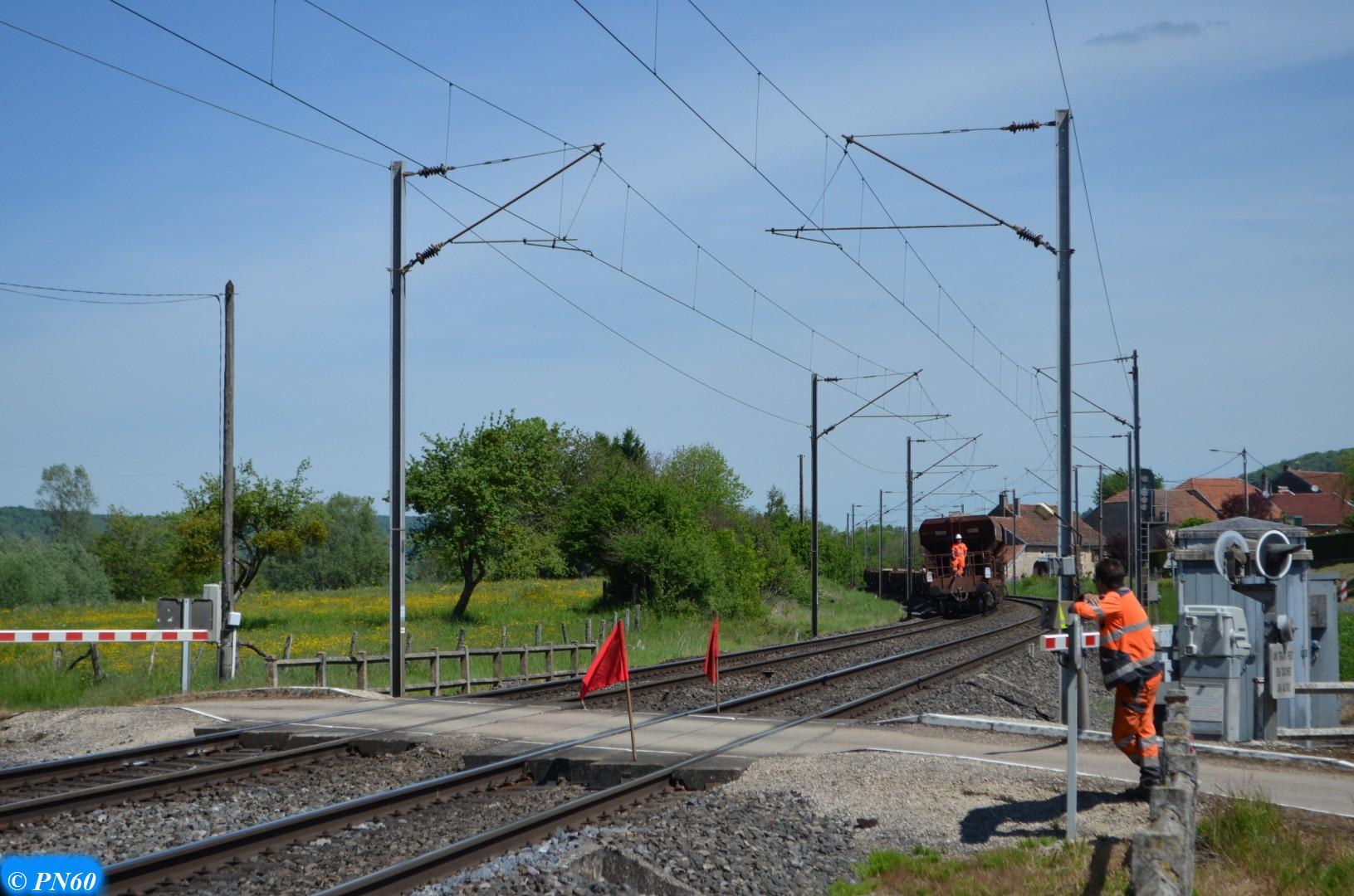 Toujours le 22 mai 2017, nous retrouvons notre train de travaux cette fois ci au niveau du PN 57 d'Hacourt, lieu d'emplacement de l'ancienne Halte Hacourt - Graffigny :D