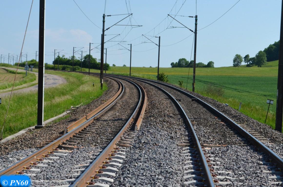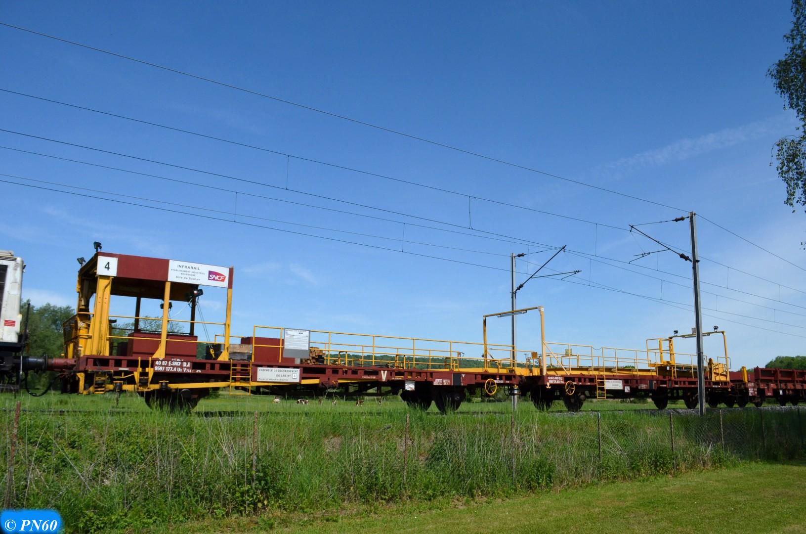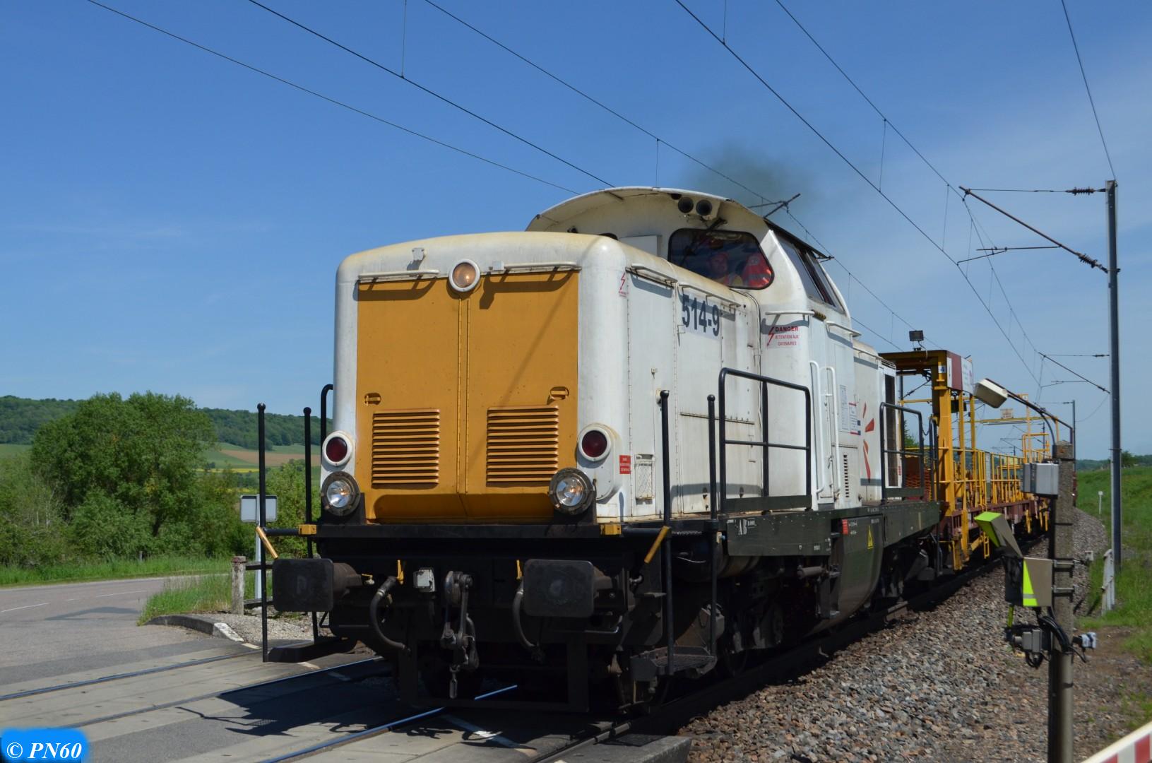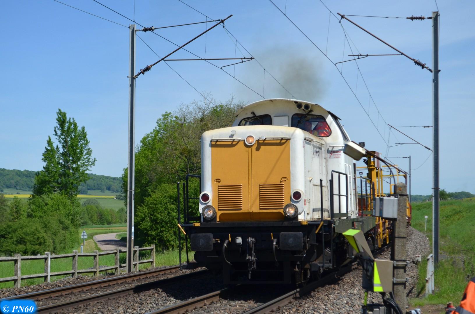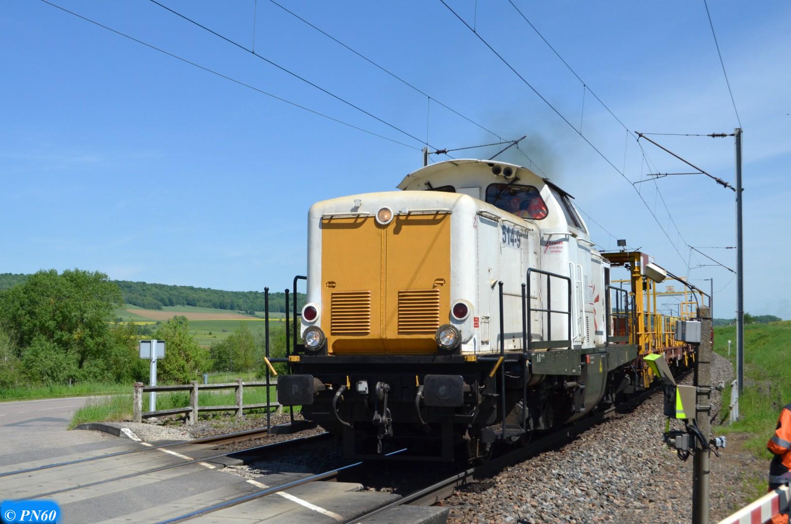 Toujours le 22 mai 2017, nous retrouvons notre train de travaux cette fois ci au niveau du PN 57 d'Hacourt, lieu d'emplacement de l'ancienne Halte Hacourt - Graffigny :D