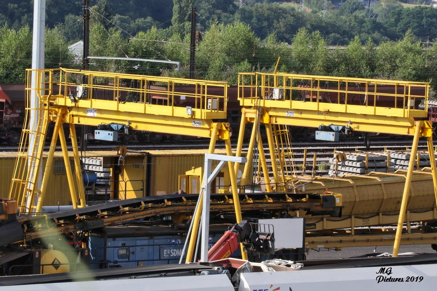 La rame de wagons tombereaux 80 87 977 x xxx-x Uas F28 avec les tapis roulants au Puy-Imbert le 20-07-2019