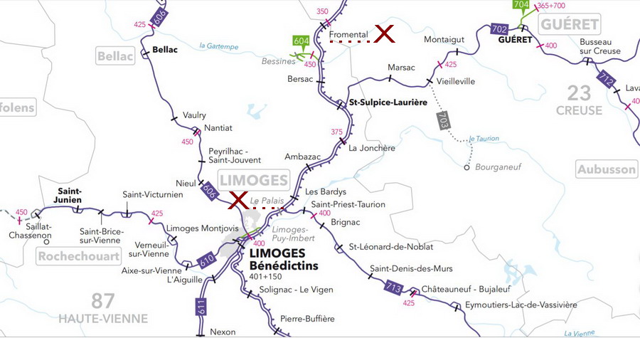 la carte pour le RVB sur le POLT entre Fromental PK 351,562 et Le Palais-sur-Vienne 392,669