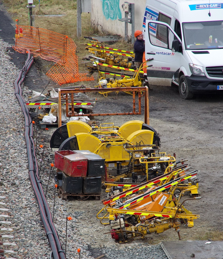 des Clipseuses 34.01 Robel + des Tirefonneuses Geismar Stumec TS 2 + des Frappeurs de rail MR 5121 Geismar sur la base de travaux de Colas Rail à la bifurcation de Jussy le 19-02-2018