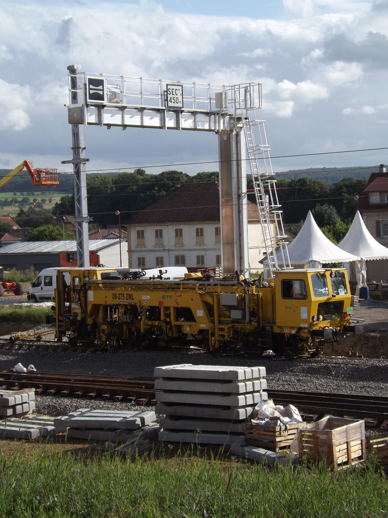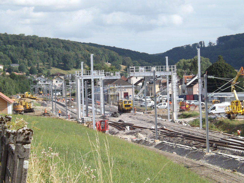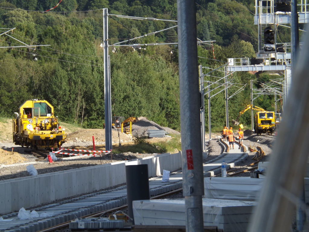 De nouvelles aiguille son aussi en place L'ensemble de la voie est presque entièrement monté côté Belfort. Le ballast cachant certaine partie.