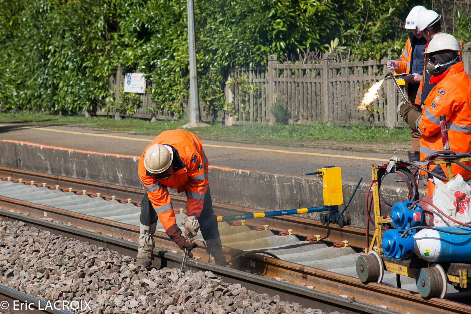 Derrière le train de renouvellement, la découpe et le ramassage des rails usés...