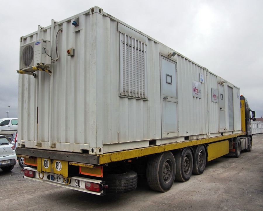 et maintenant le déchargement de deux bungalows (location Techni groupe) de l'Infralog National par la société T2E Levage