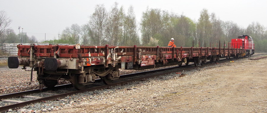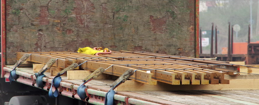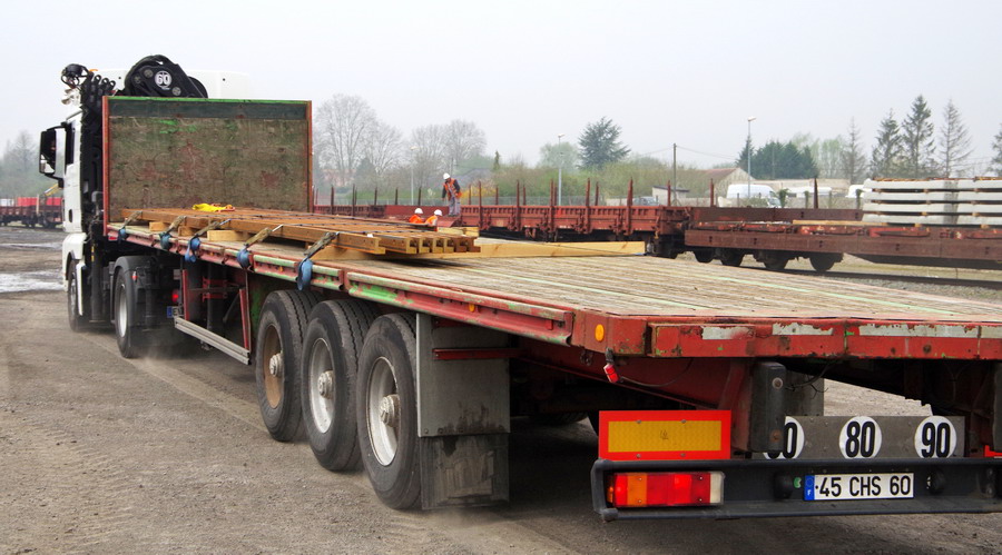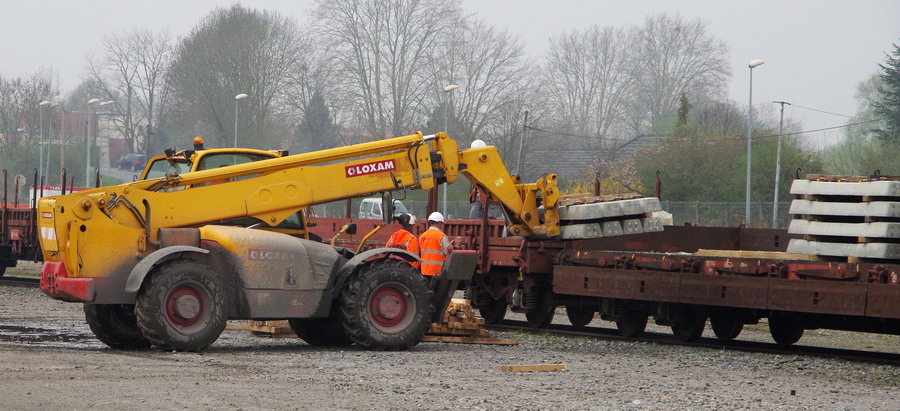 déchargement de la rame des traverses béton pour le stock de la base de travaux de Laon le 09-04-2018