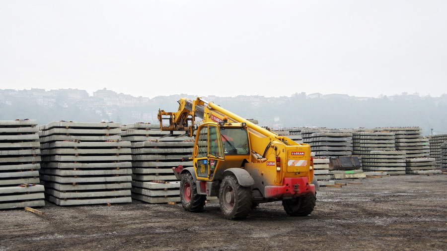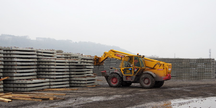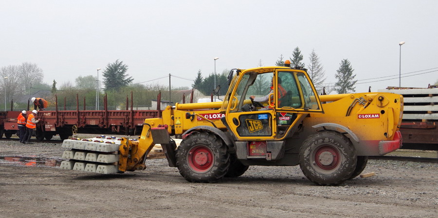 déchargement des traverses béton de la rame par un chariot télescopique LOXAM pour le stock de traverses pour le RVB