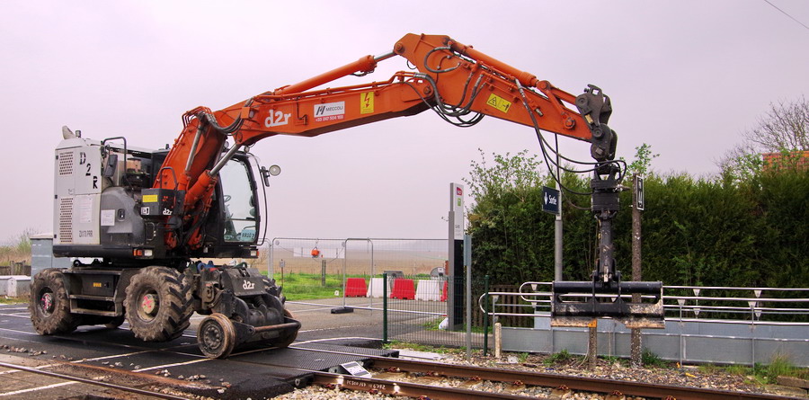 arrivée au niveau du PN n°44 de la gare de Flavy-le-Martel des deux Pelles Rail route d'ENCO en location par Meccoli