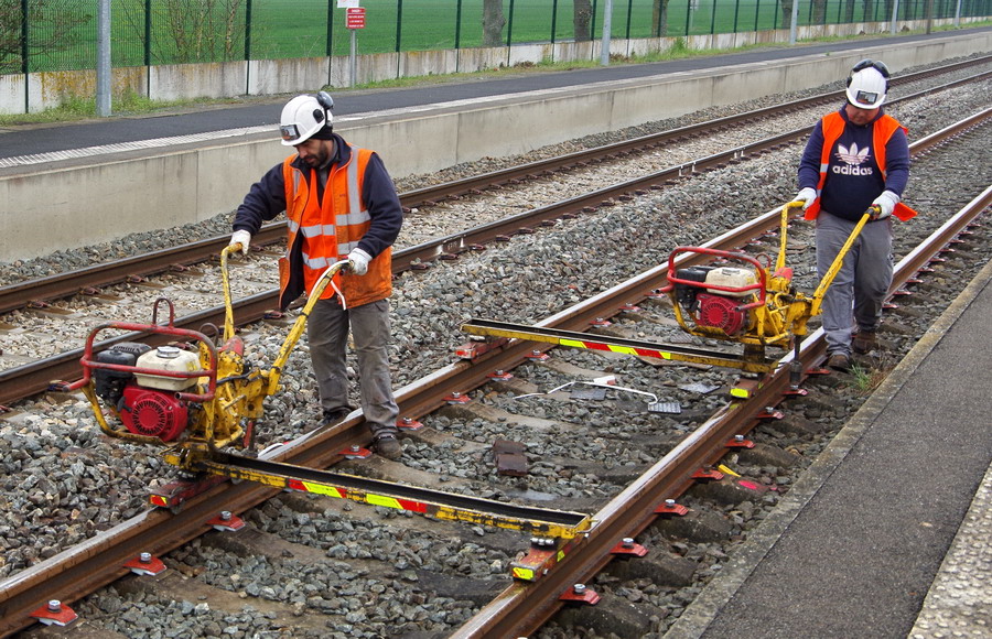 mise en place des Chevalet Railtech pour la séance de soudure aluminothermique en gare de Flavy-le-Martel