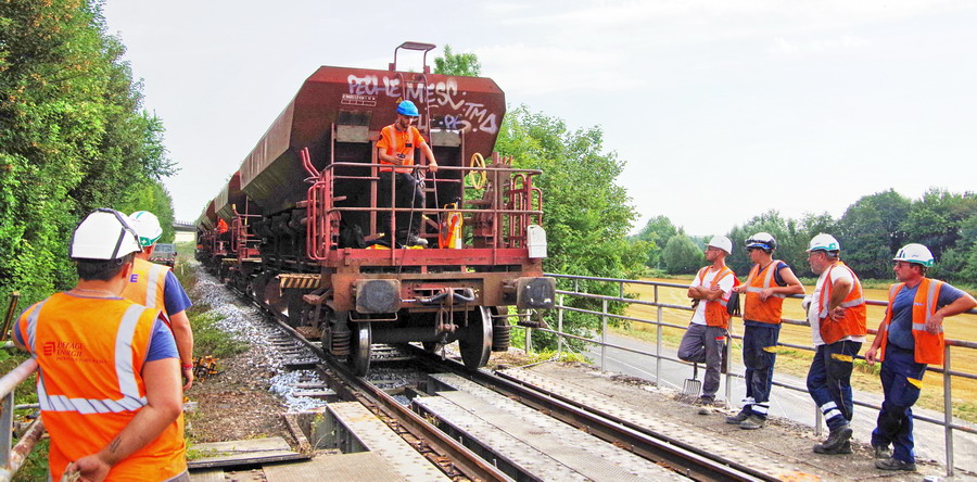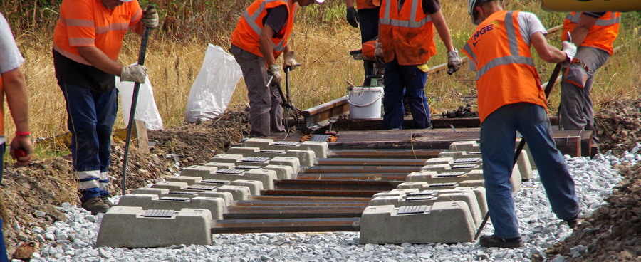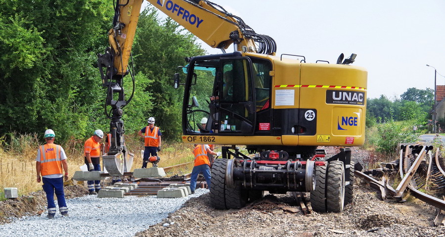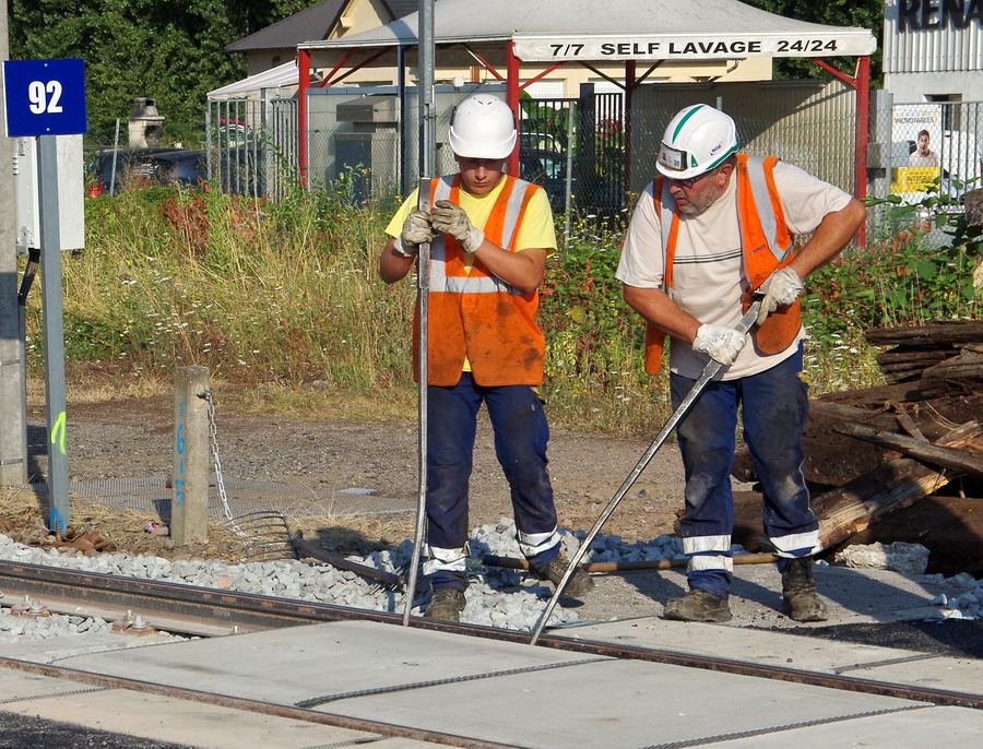 mise en place des novelles traverses en bois à la jonction de l'ancienne et de la nouvelle voie au niveau du PN n°92