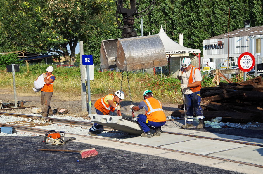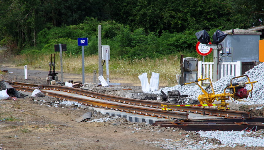 avec l'installation pour le PN n°92 des plaques de Platelages en grandes dalles préfabriquées en béton armé avec gorges où sont maintenus les rails à l'aide d'attaches classiques de la société Chapsol