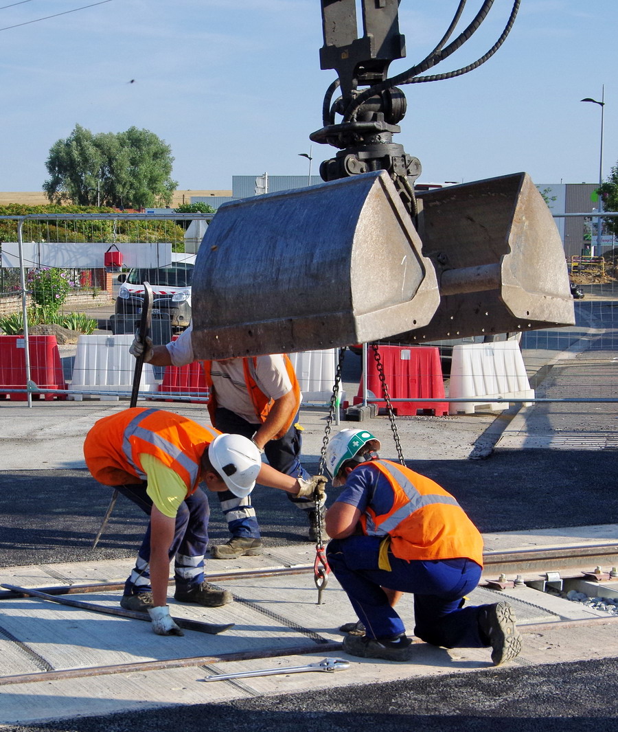 Cette solution a été retenue par la SNCF pour plusieurs réalisations sur le réseau ferré. Les raisons de ce choix ont reposé sur la rapidité de pose des dalles préfabriquées en béton afin de pénaliser le moins possible la circulation routière. La solution à attaches classiques permet de faciliter les interventions de dépannage et d'entretien par rapport à d'autres systèmes de maintien du rail.