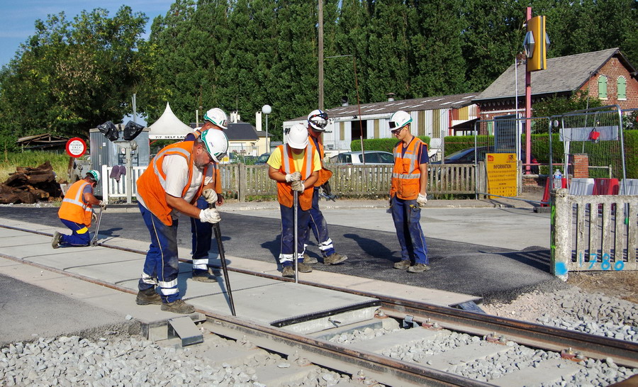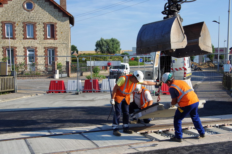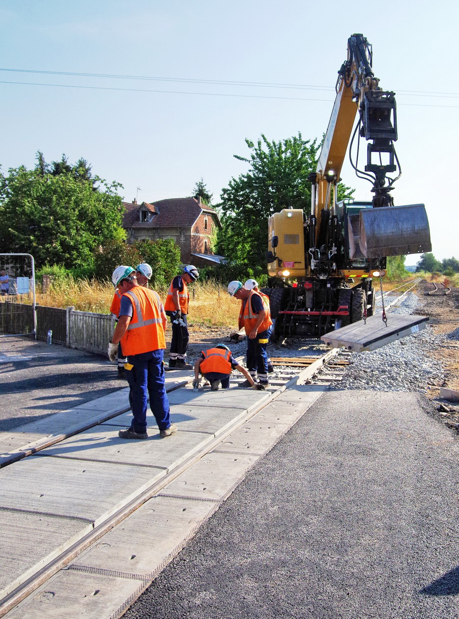 l'installation des plaques de Platelages en grandes dalles préfabriquées en béton de la société Chapsol pour le PN n°92 à Marle-sur-Serre (02) le 27-07-2018