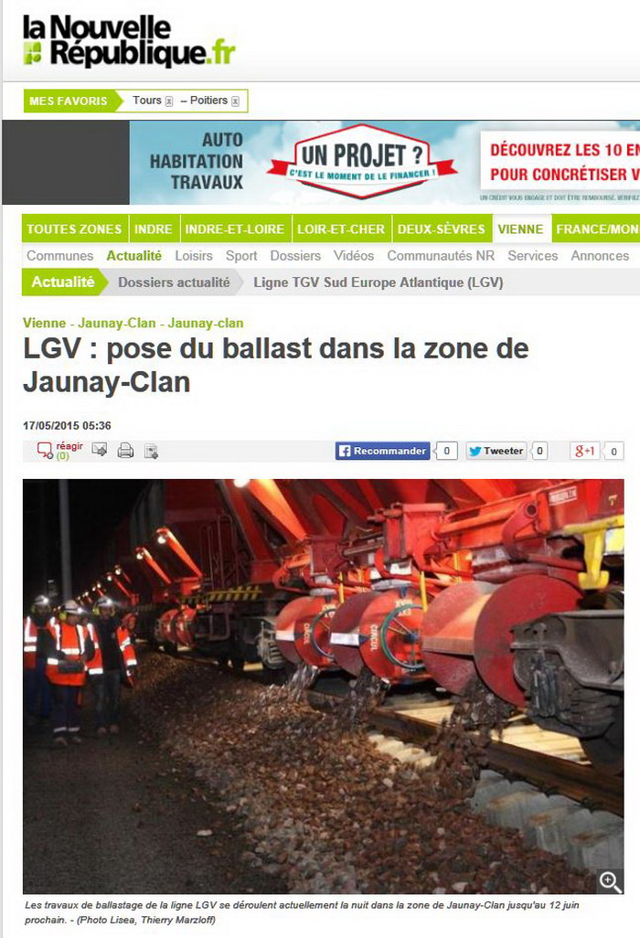 "Pose du ballast dans la zone de Jaunay-Clan" le lien de l'article http://www.lanouvellerepublique.fr/Vienne/Actualite/Dossiers-actualite/n/Contenus/Dossiers/Actualite/Ligne-TGV-Sud-Europe-Atlantique-LGV/Suivi-du-projet/LGV-pose-du-ballast-dans-la-zone-de-Jaunay-Clan-2331314