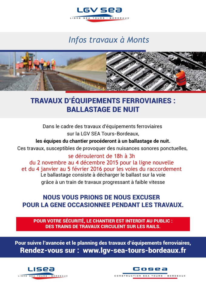 Coséa interviendra sur Chambray les Tours du 09 au 20 novembre pour la pose des rails et les nuit du 16-11 au 18-12-2015 pour le ballastage sur la voie