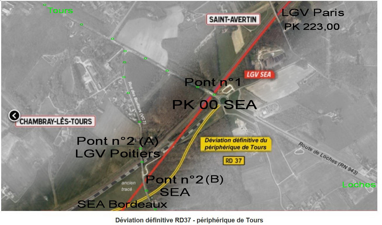 Voici maintenant le PK 0,5 en direction des PK 00 de la SEA et de la déviation du PK 223,00 de la LGV pont n°2 de la rue des Bavilliers VC 7 de la route D 943 Tours Loches à Chambray les Tours en direction de Veigné