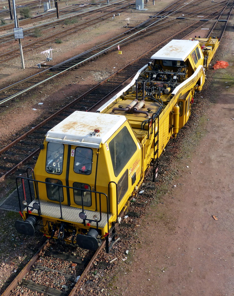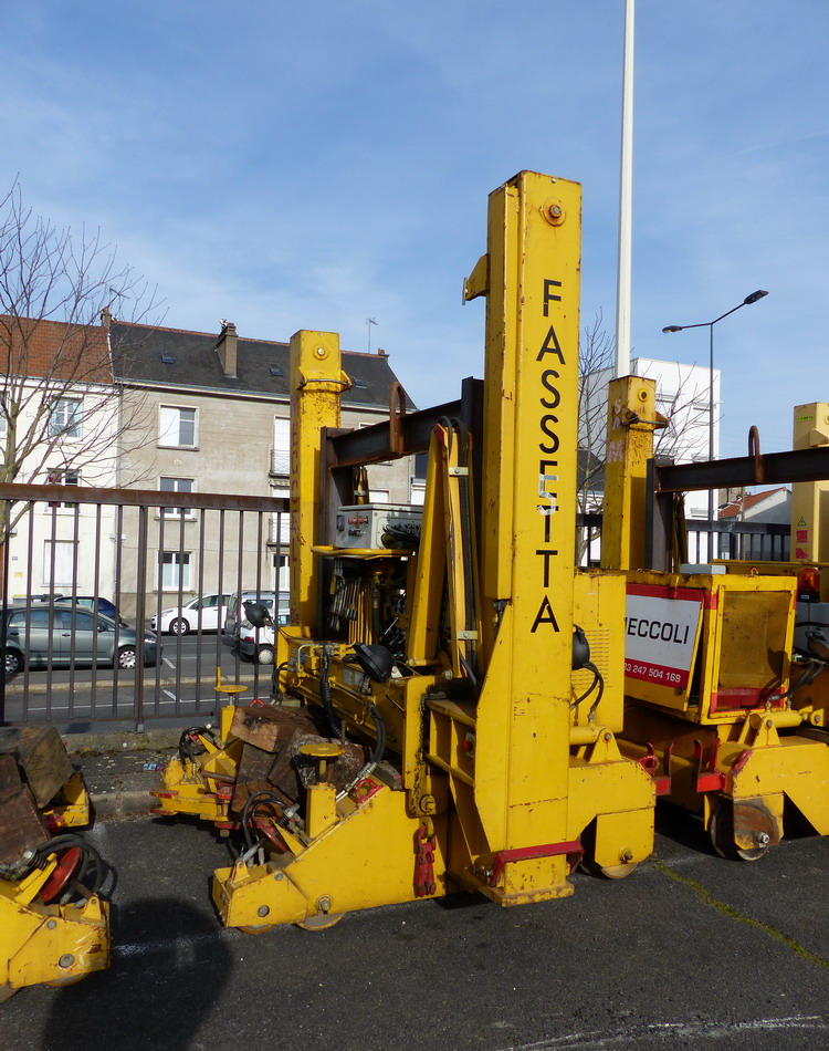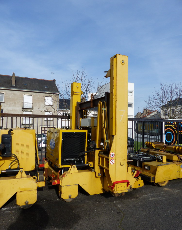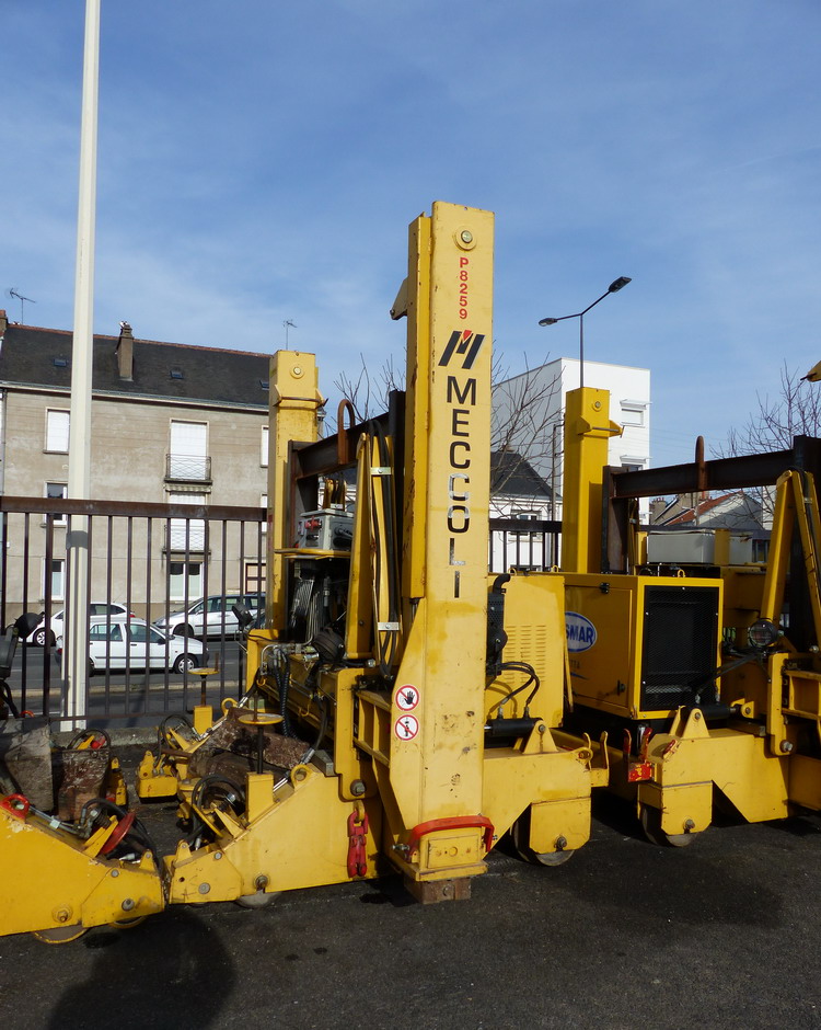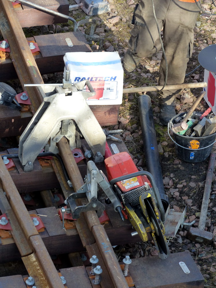 Le triangle jaune dont tu parles est tout simplement une équerre. Elle permet de vérifier que la traverse est bien perpendiculaire au rail.