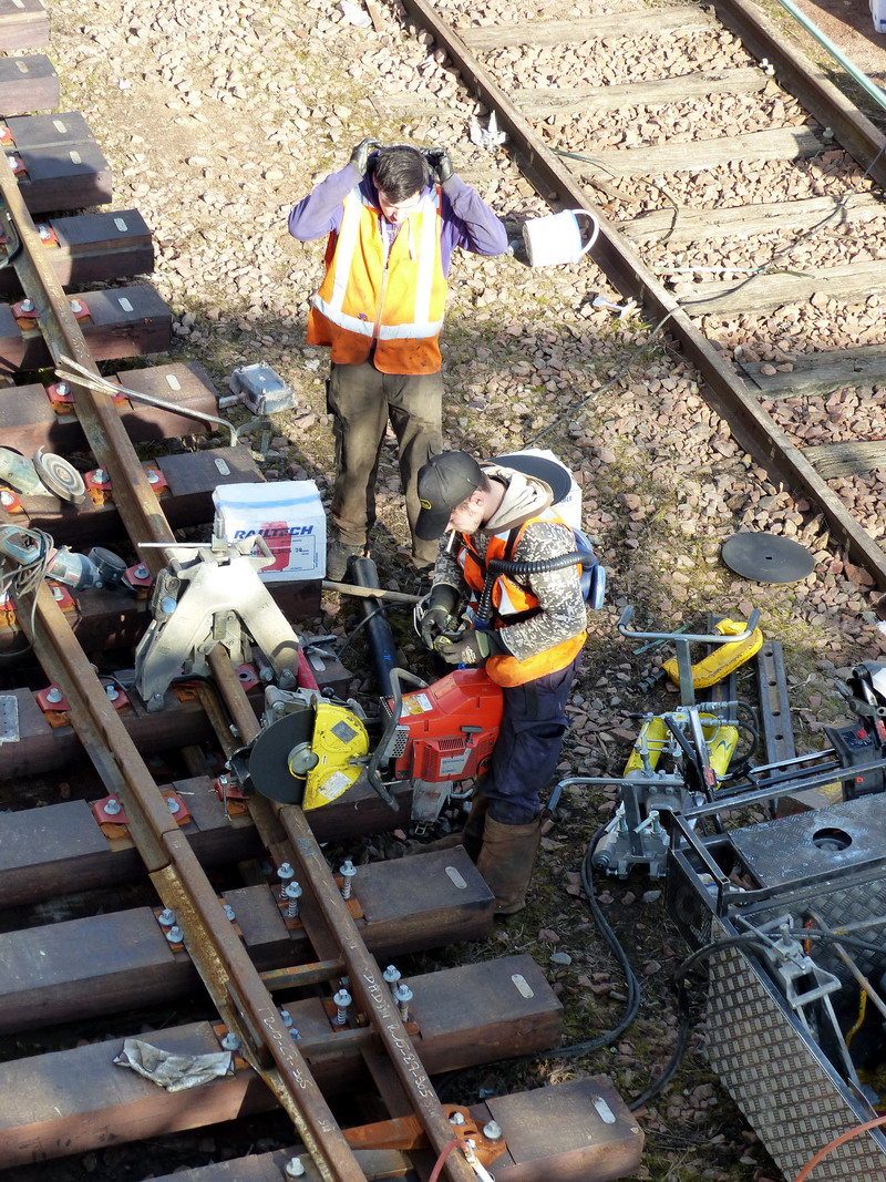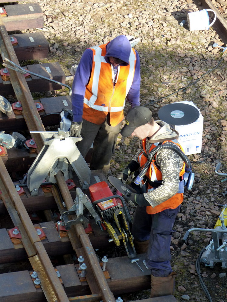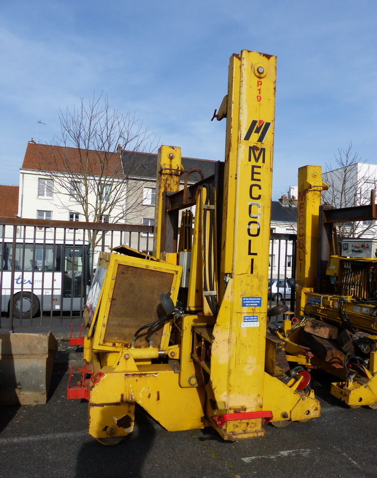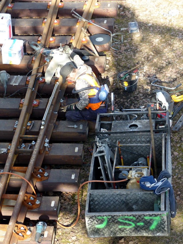 Le triangle jaune dont tu parles est tout simplement une équerre. Elle permet de vérifier que la traverse est bien perpendiculaire au rail.