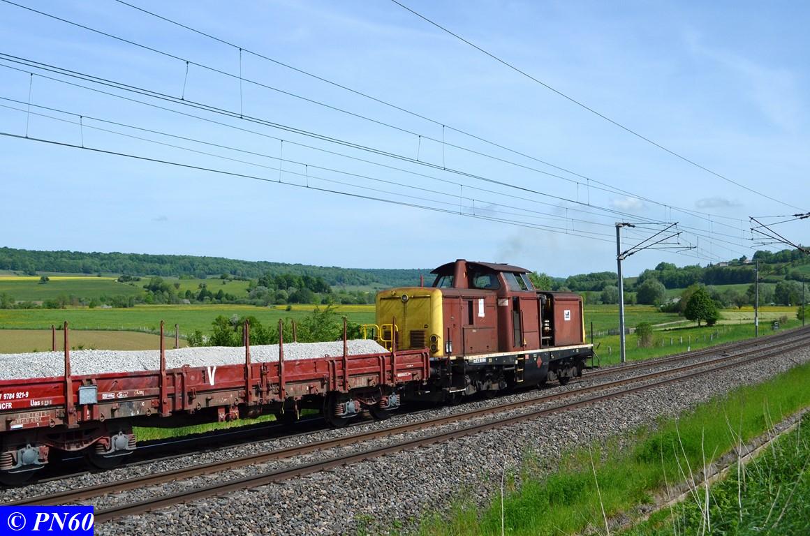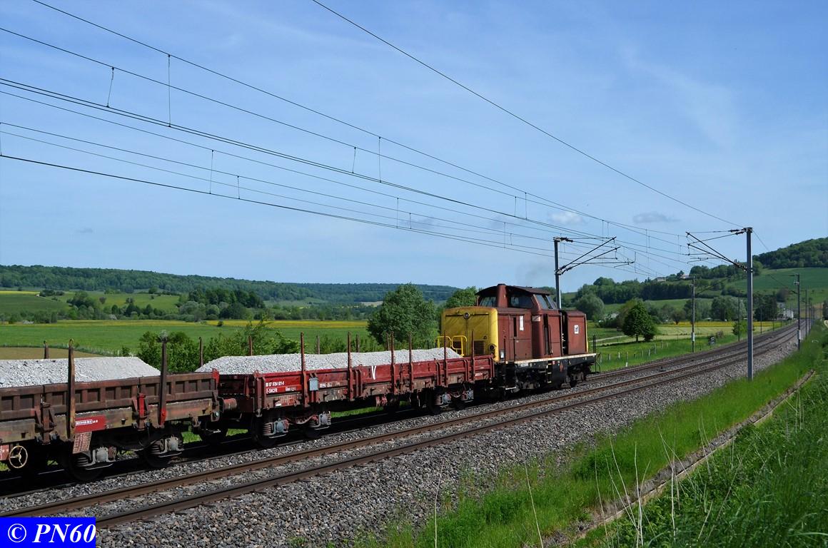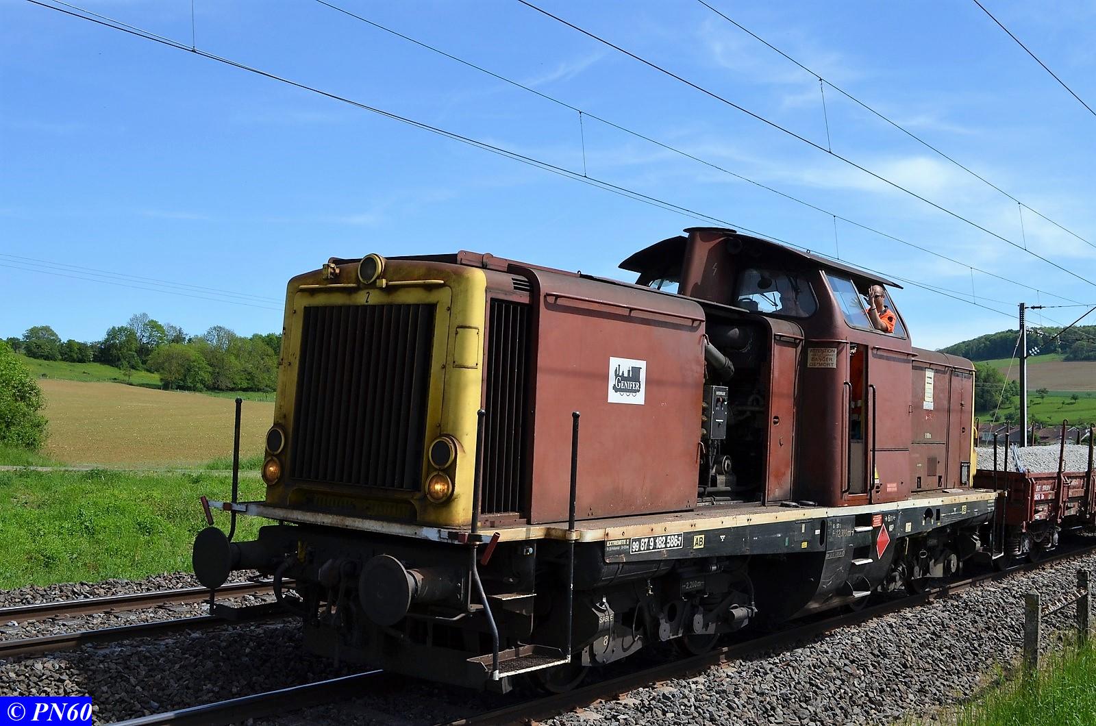 Le 23 mai 2017, un nouveau train de travaux poussé par la V212 GENIFER n° 87 9 182 586-7 regagne sa zone de chantier.