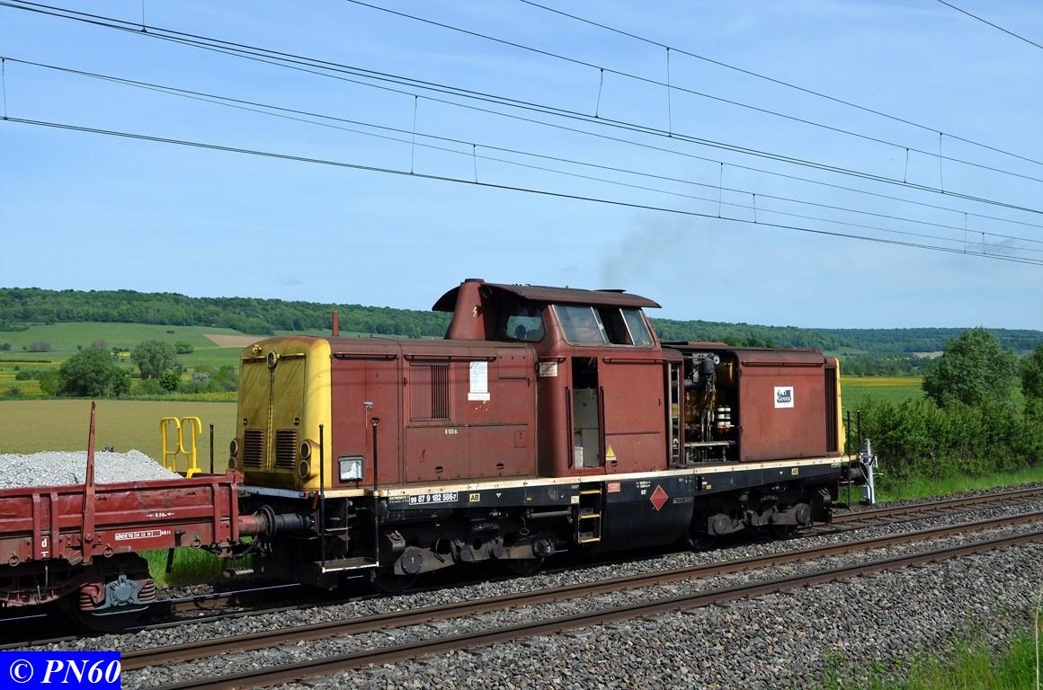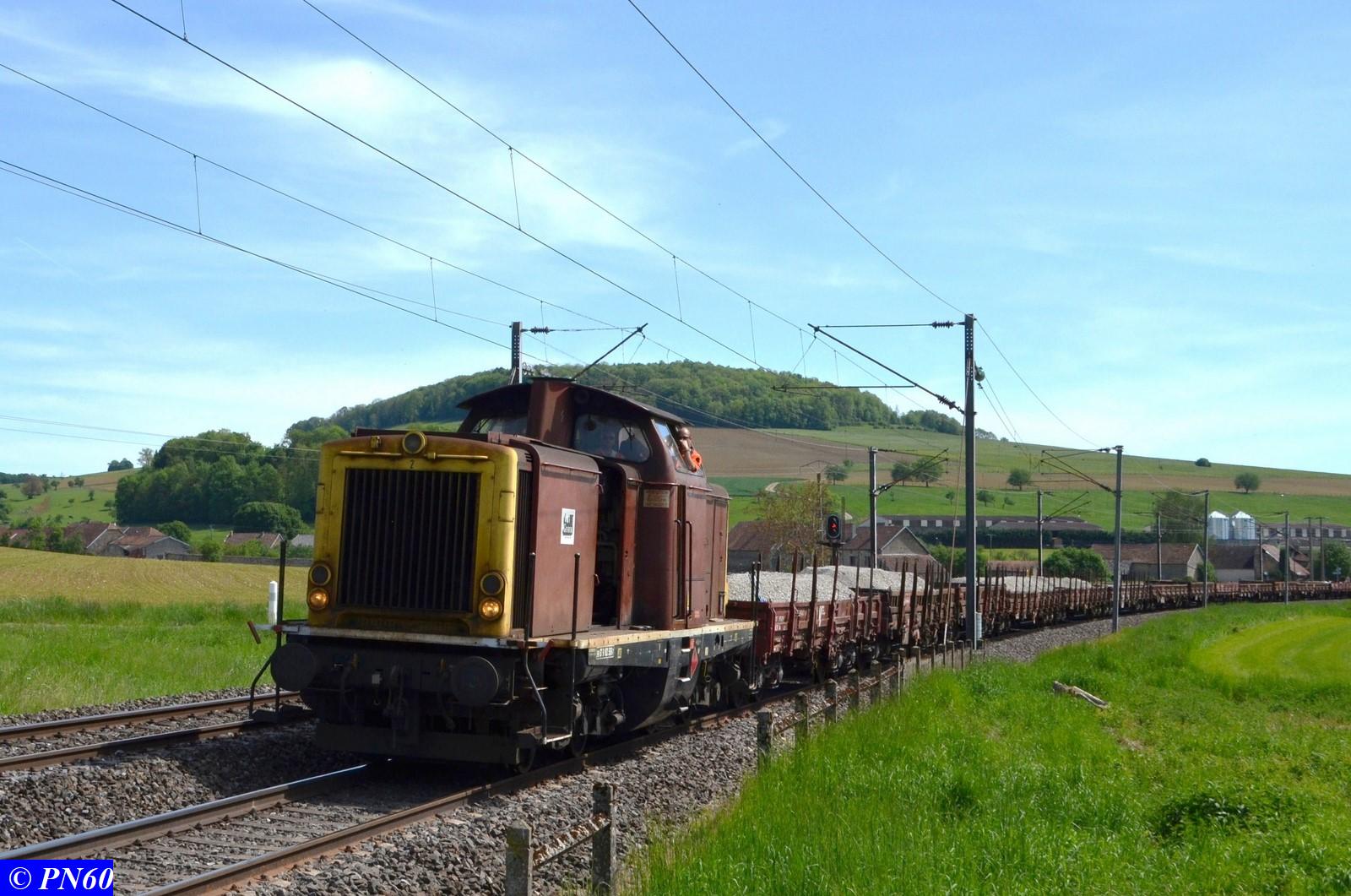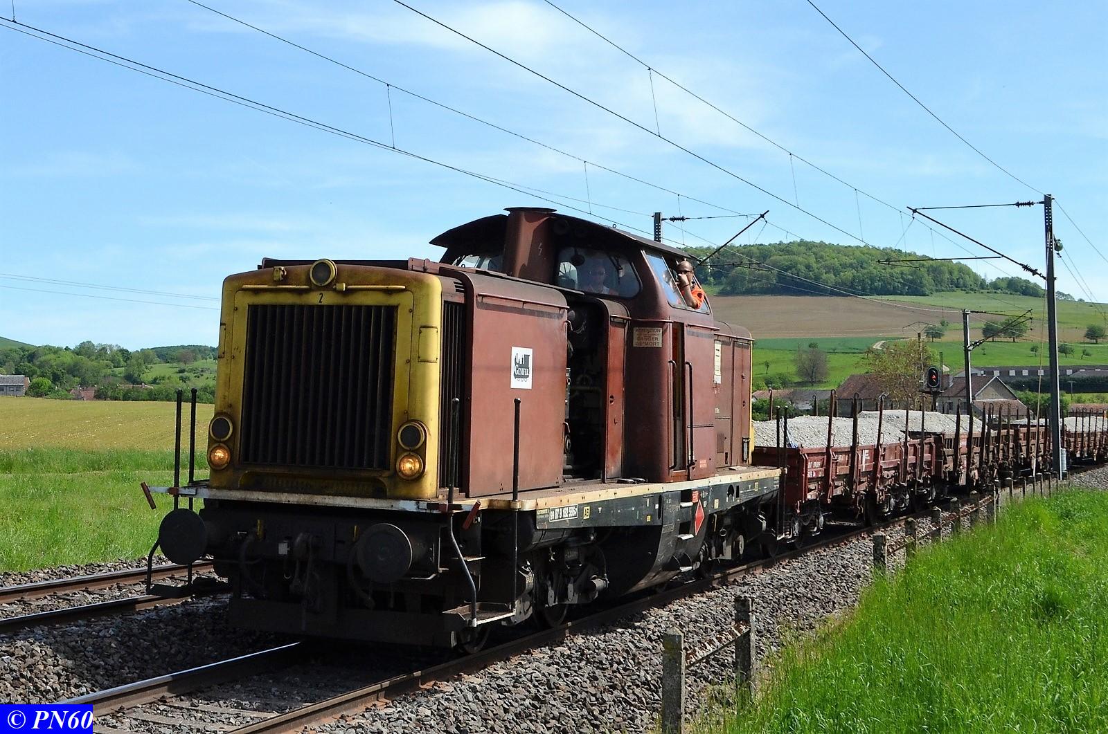 Le 23 mai 2017, un nouveau train de travaux poussé par la V212 GENIFER n° 87 9 182 586-7 regagne sa zone de chantier.