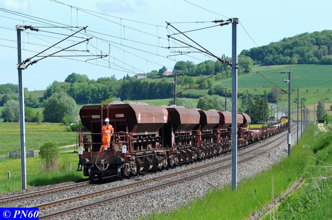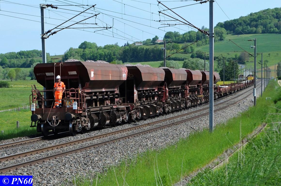 Le 23 mai 2017, un nouveau train de travaux poussé par la V212 GENIFER n° 87 9 182 586-7 regagne sa zone de chantier, suite...