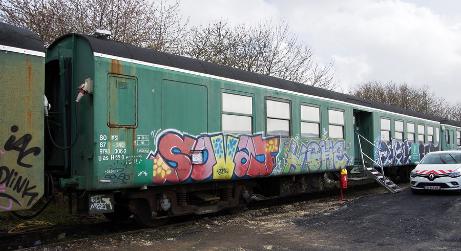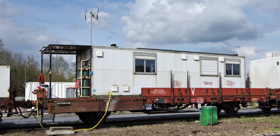 80 87 979 3 023-0 Uas H55 0 F SNCF-RS point d'attache Châlons-en-Champagne [voiture dordoir] sur la base de vie de la gare de Chaulnes le 13-04-2018