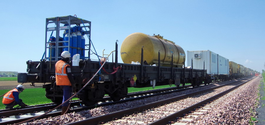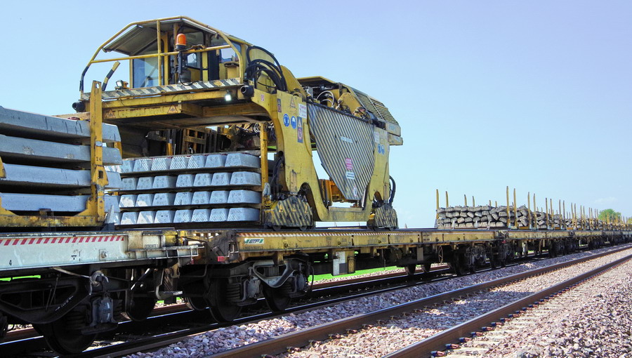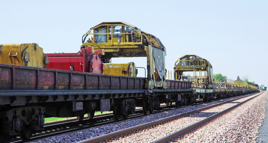 wagon 5 WF - force avec poutre : évacuation du ballast, enlèvement des anciens rails et pose de nouveaux longs rails soudés