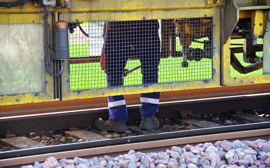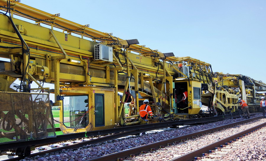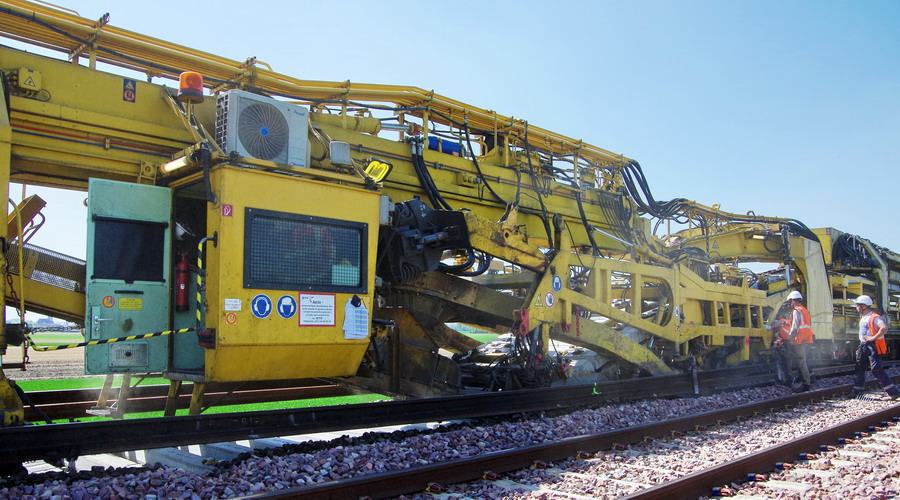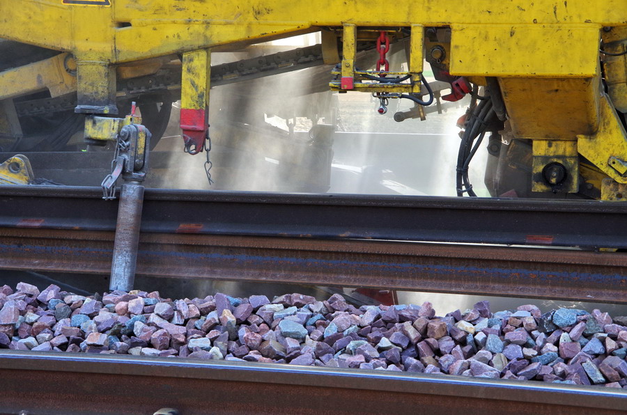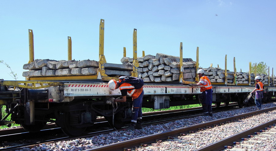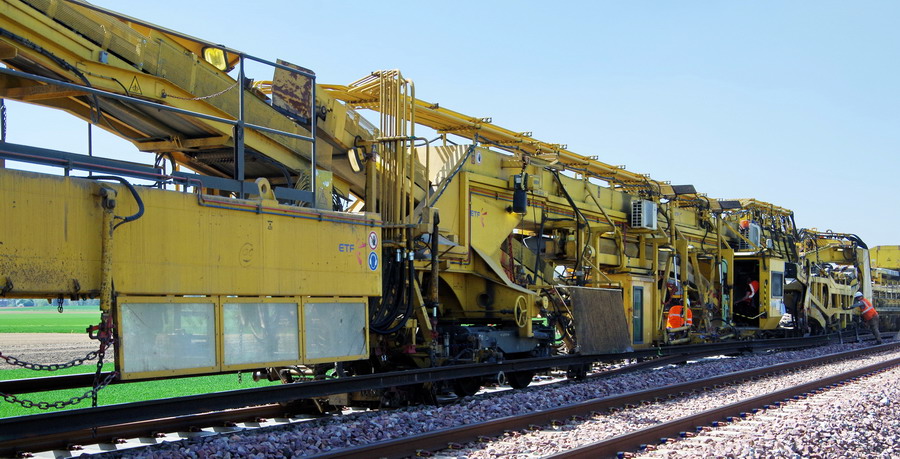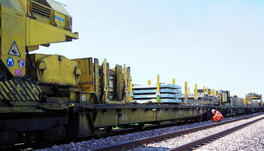 . wagon 5 WF - force avec poutre : évacuation du ballast, enlèvement des anciens rails et pose de nouveaux longs rails soudés