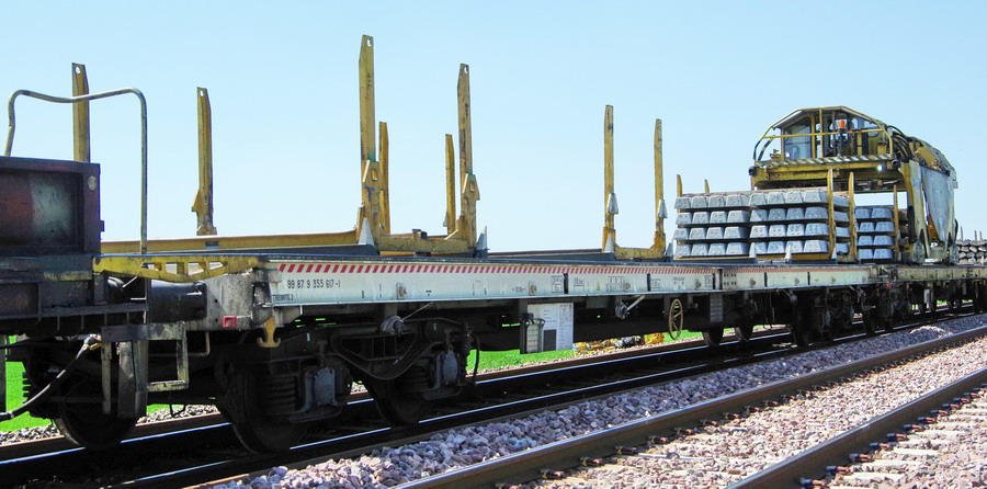 wagon 1 WEK - de tirofonnage transportant les 2 PMP (Portique de manutention des palettes de traverses)