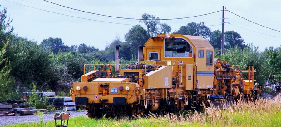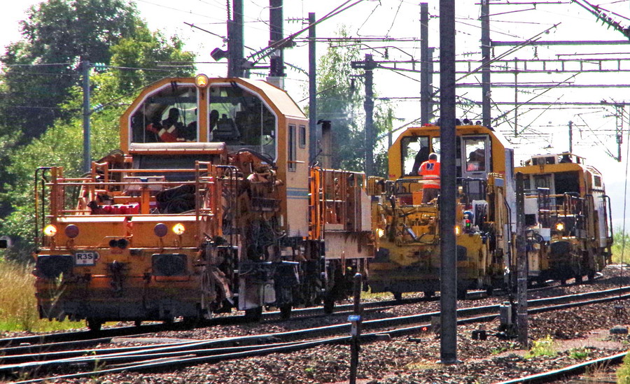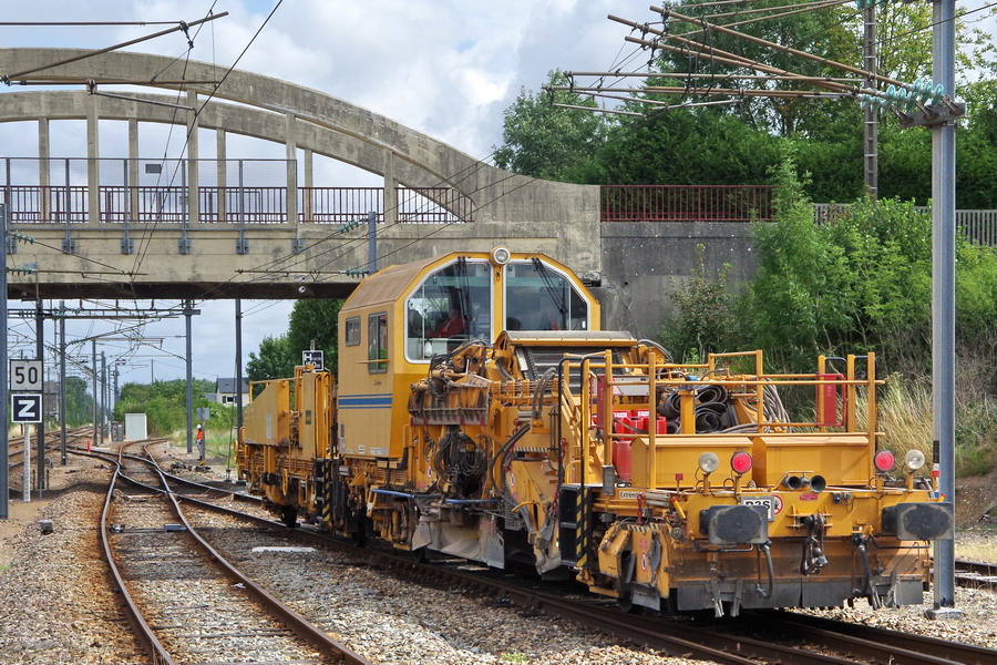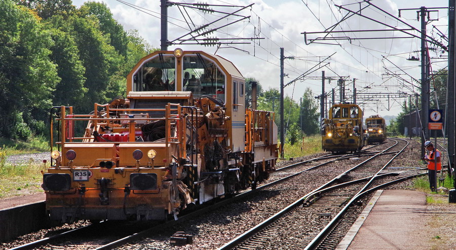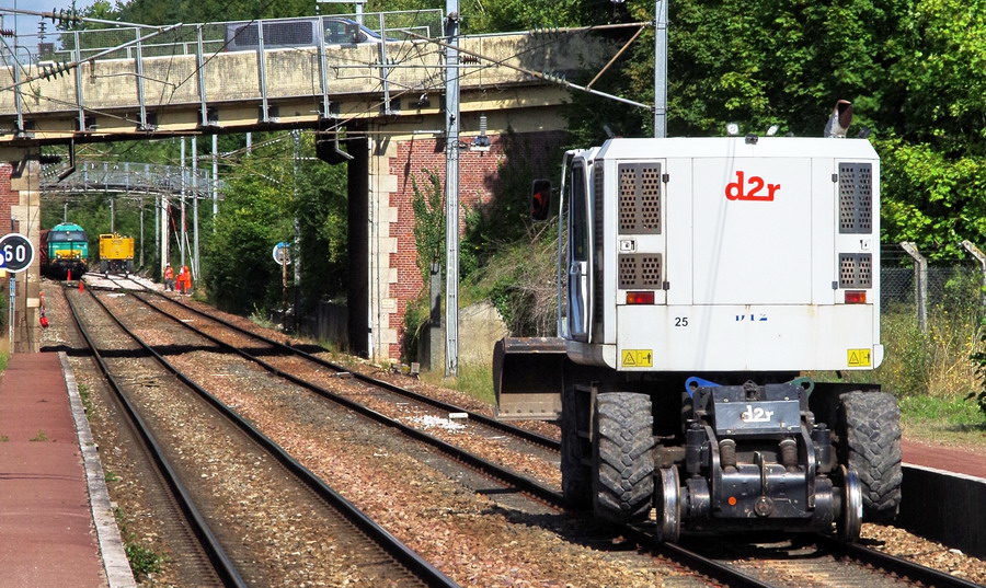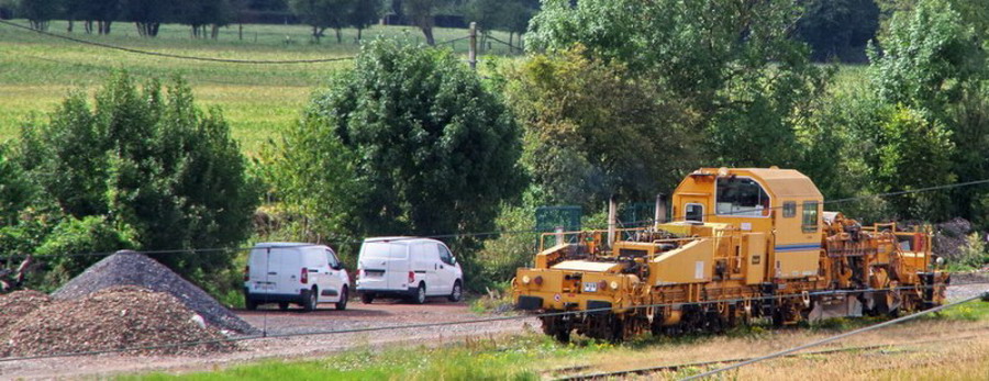 et maintenant sortie des engins de régalage et de bourrage de la base de travaux de la gare de Poix de Picardie pour