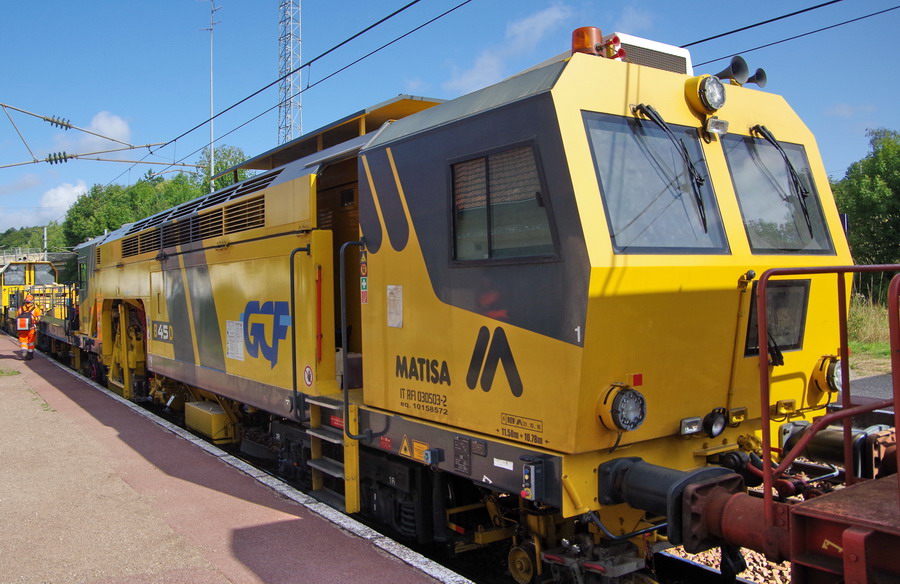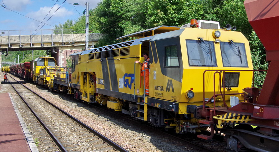 Bourreuse B45D Matisa n°4538 - 92 87 9 222 013-8 - GCF sur le train de ballast en gare de Poix de Picardie le 20-08-2019