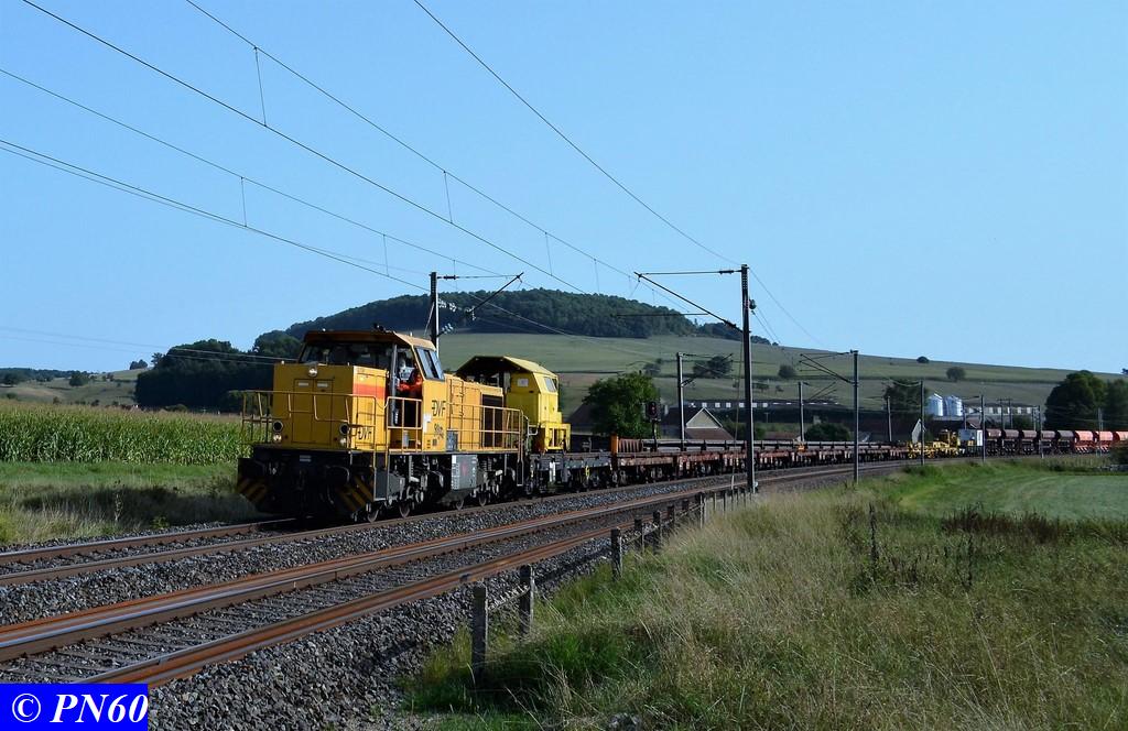 Un autre train de travaux photographié le 29 août 2017 sur la ligne 15 à Brainville sur Meuse. Celui-ci est tracté par une G.1206 DVF (Dijonnaise de Voies Ferrées).