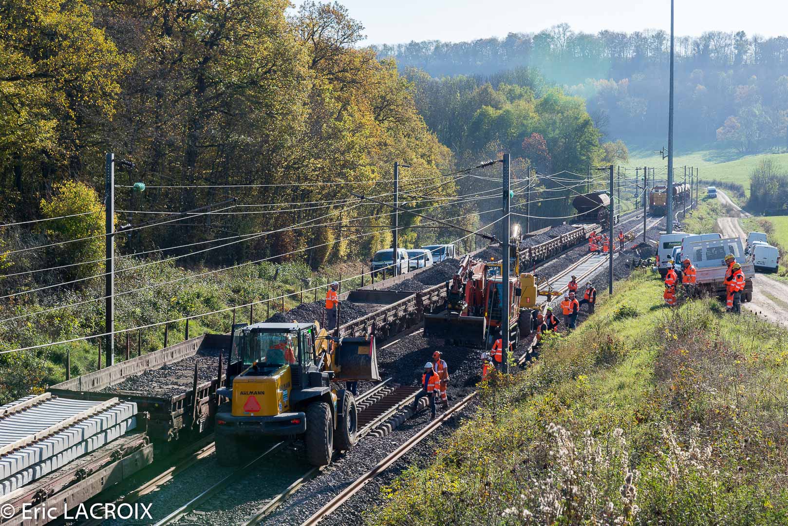 Le RVB ayant pris du retard, un chantier hors suite rapide œuvre voie 1 dans le secteur de Plesnoy (52). Ce chantier, en renfort de la suite rapide, permet de gagner 80 à 90 mètres par jour.