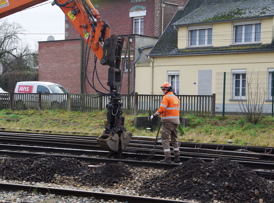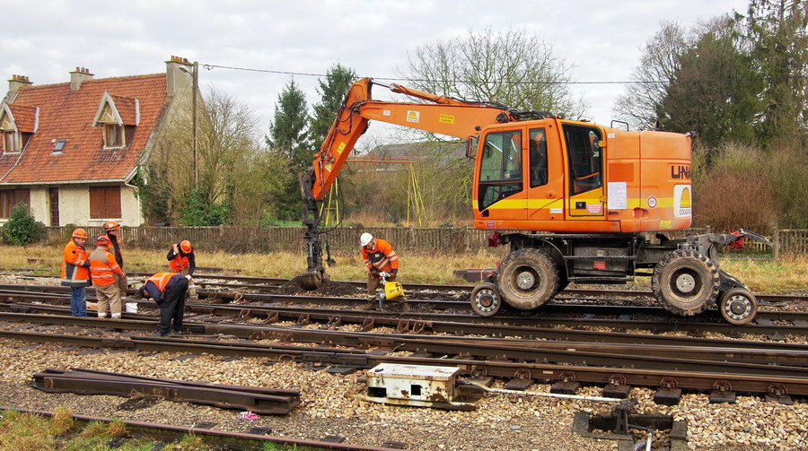 au premier PN de l'entrée de la commune avec une Pelle Rail route UNAC 22 TRR - CATM315DLW5M05000 de Colas Rail