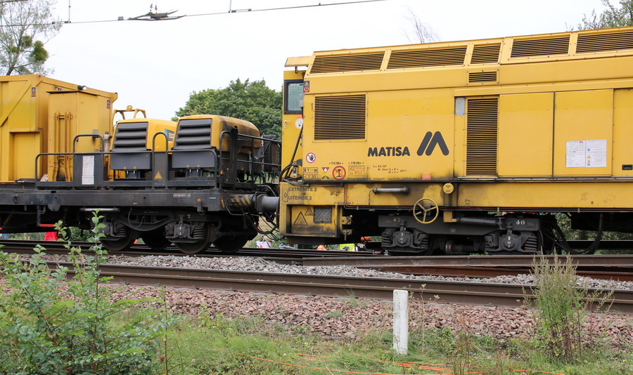 les autres engins Bourreuses Meccoli et ETF + rame de wagons plats R87 5 ETF (transport de traverses conditionnées sur palettes) + train F1F2 rame de ramassage et de finition en fin de chantier