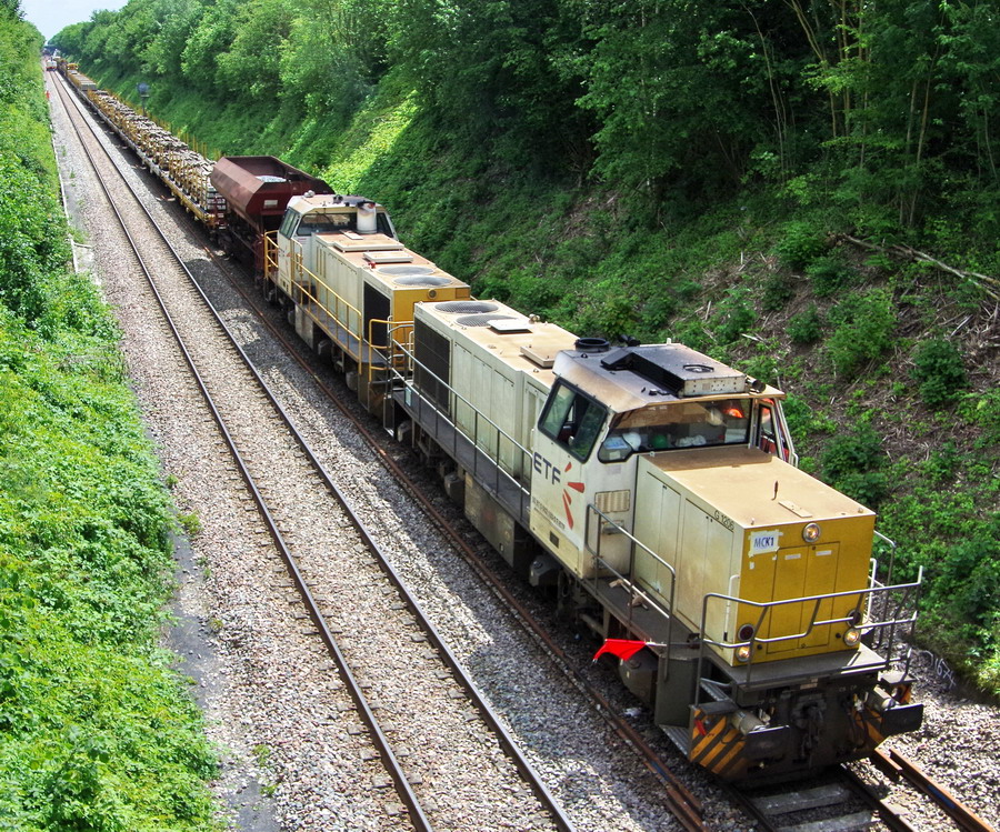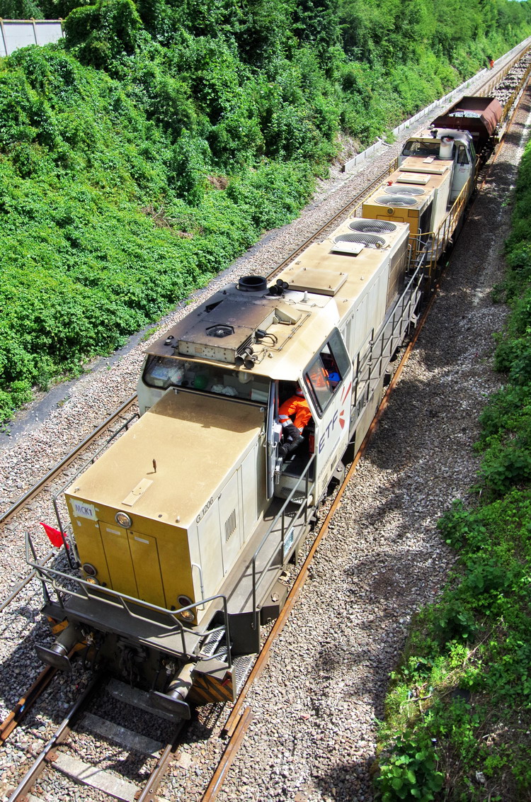 en plein travail pour le RVB avec deux machines Vossloh G 1206 ETF en tête et une en queue